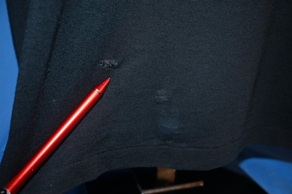 Fits like a modern unisex adult extra large. There are repairs on the front and some discoloration, see pics