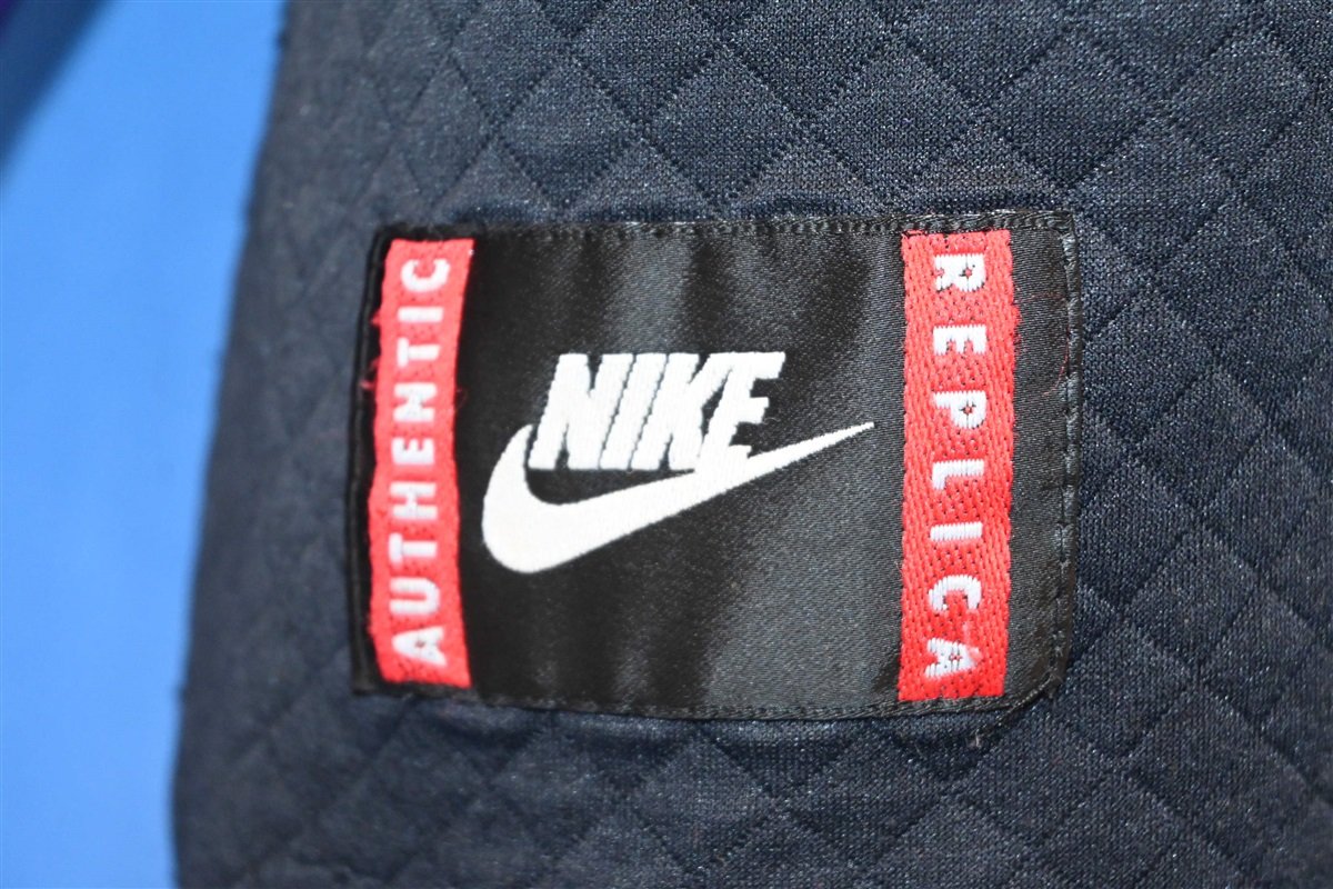 This cool vintage football jersey was made for the Premier League soccer team, Arsenal. This shirt is a reproduction of the jersey worn by the team's star goalkeeper, David Seaman in the mid 90s, and the back even has Seaman's jersey number. The back also features the Irish surname, Roney. Considering there's never been any Arsenal players with this name, this jersey was likely personalized for a fan.