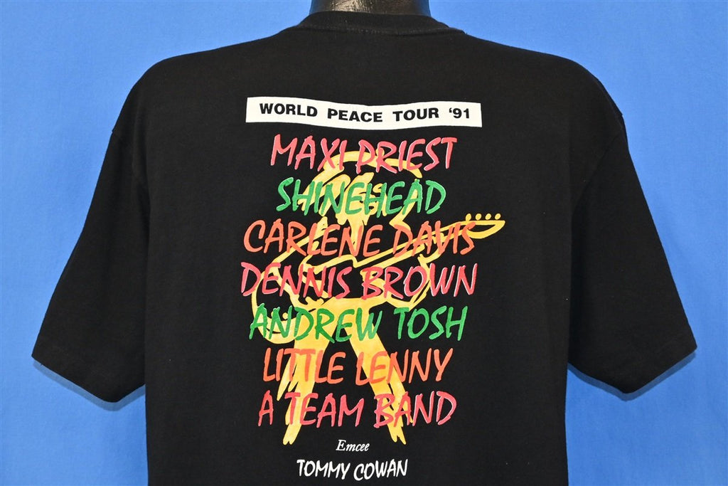 This awesome concert tee commemorates the 1991 Reggae Sunsplash World Peace Tour. It's aged really over after all this time, preserving that old school magic for years to come. Features double sided print, eye-catching graphics, and a lovely cotton feel. So comfy and nice to look at.