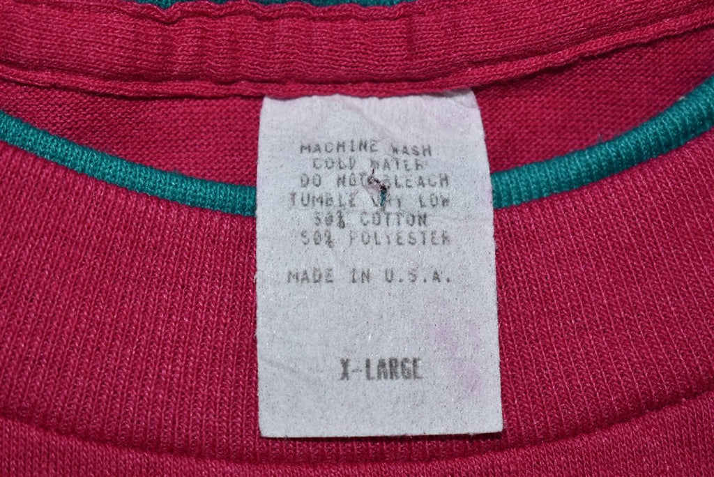 This vintage tee is super comfy and fun to look at. It's a nineties original loaded with cute animal graphics, soft poly cotton, and rollup sleeves for that old school vibe. The imagery spotlights a rabbit, sheep, and kitty- somewhat reminiscent of Spring or Easter.