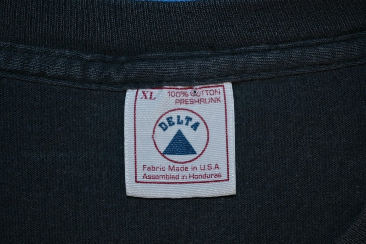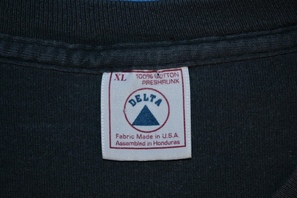 This awesome vintage tee sports a massive graphic of one of the most notorious villains in the history of pop culture. The shirt showcases Darth Vader, the main antagonist of George Lucas' original trilogy of Star Wars movies. Darth Vader first appeared in Episode IV: A New Hope in 1977, where he was portrayed by both David Prowse and James Earl Jones. Prowse, who was professional bodybuilder, provided the physical body for the imposing character, while Jones gave Vader his deep, commanding voice.