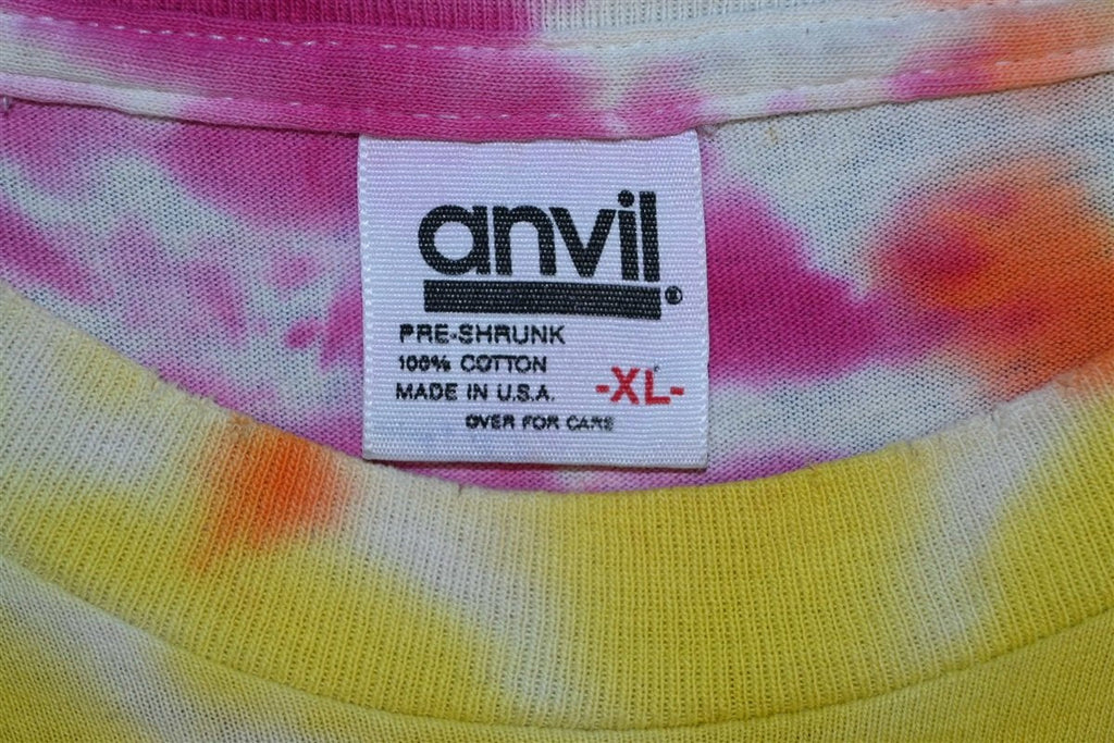 This groovy tie dye tee may be from the 1990s but it harkens back to the 60s, a time of free love and flower power. It prominently features a peace sign made of mushrooms and flowers. The symbol was first used in the British nuclear disarmament campaign and it quickly became a symbol for the counter culture movement worldwide. Many "hippies" during the 60s and 70s wore the symbol specifically to peacefully protest the Vietnam War. Since then, it's become a general symbol of peace and hippie culture that appears on countless shirts, buttons, and decorations.