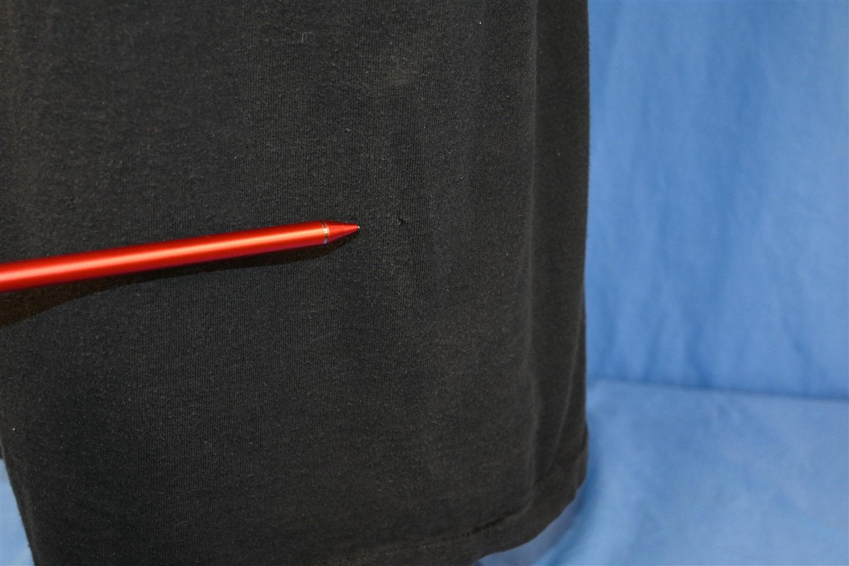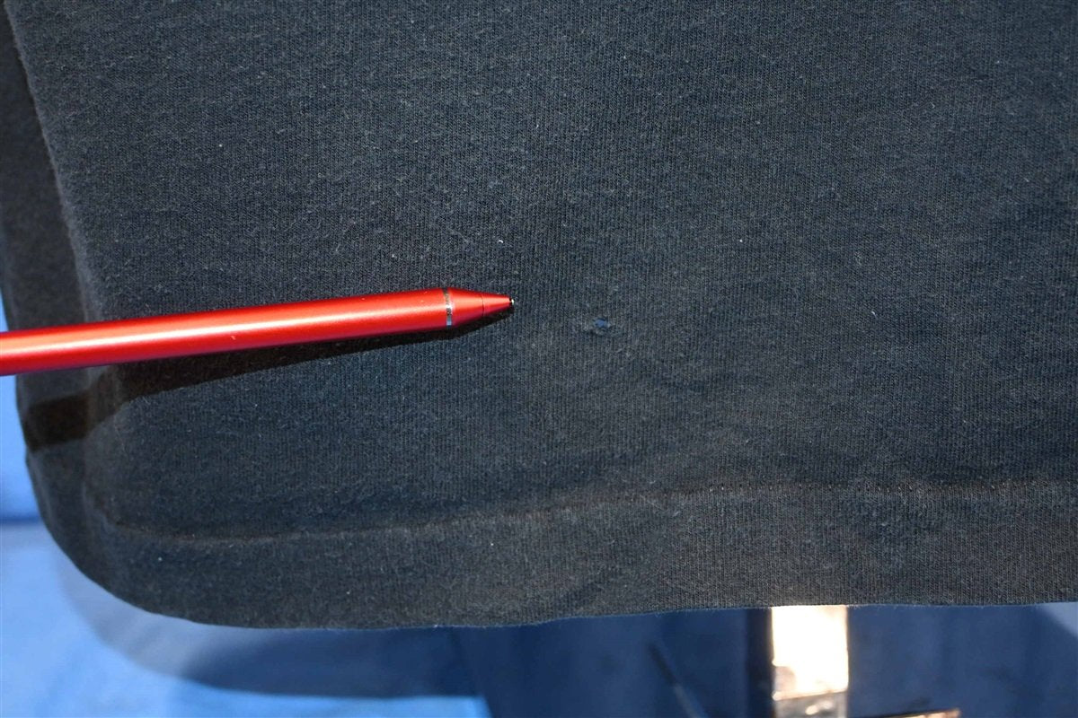 Fits like a modern unisex adult extra large. Three holes on the back, two repairs on the right sleeve if wearing, and repair on the front, see pics.