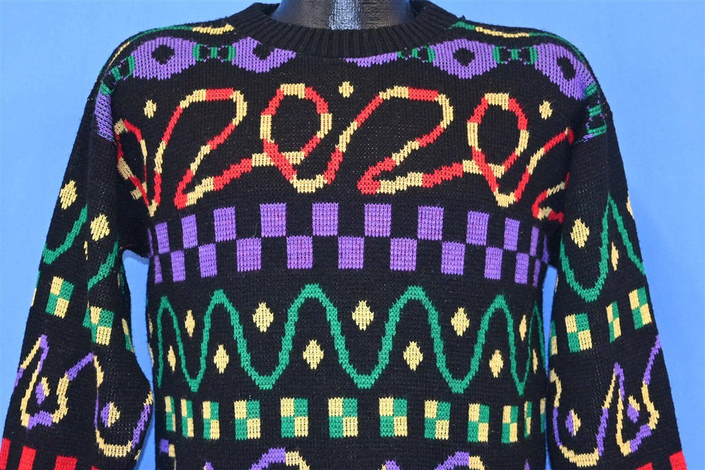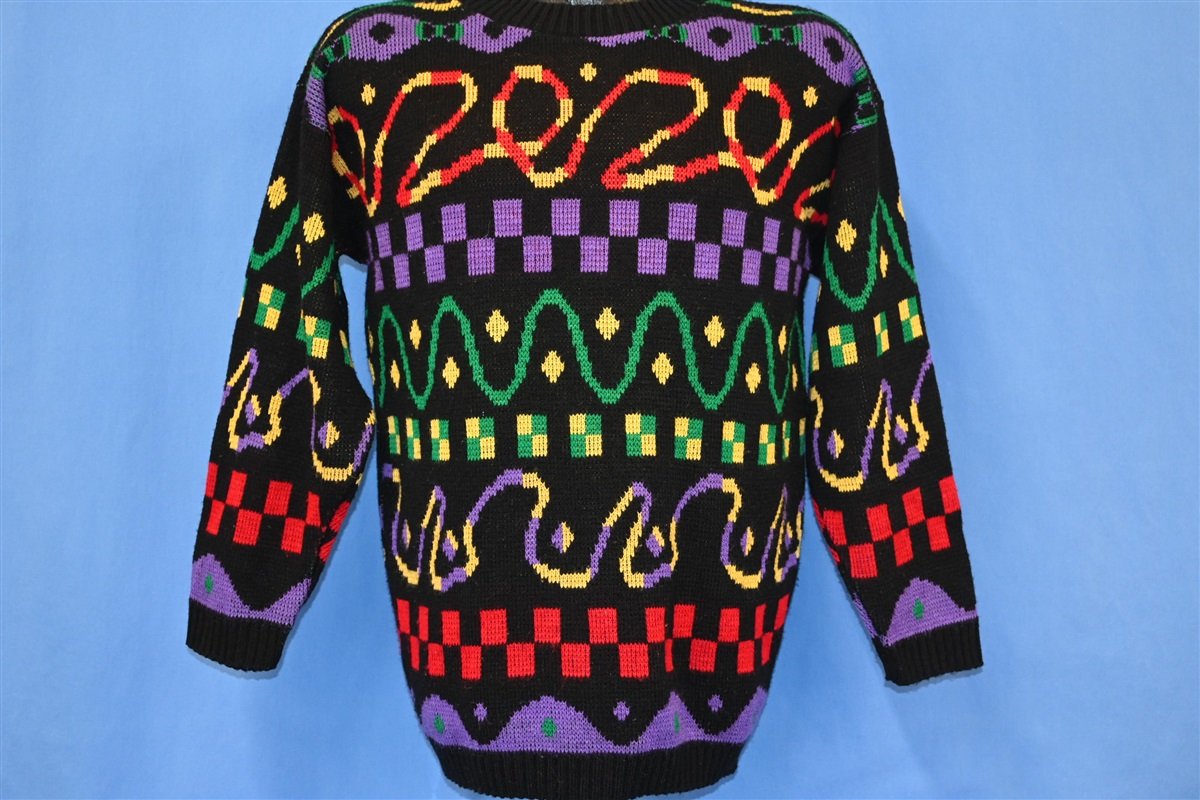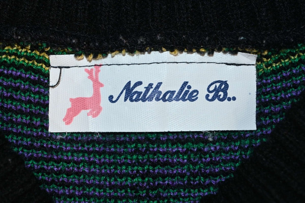 This colorful vintage sweater was made by the women's wear brand Nathalie B, and it features a vibrant pattern that is totally reminiscent of the late 80s. This sweater has a geometric pattern that perfectly shows off the influence that the Memphis design group had over fashion in the 80s, and the bold geometric design is further emphasized thanks to the black of the sweater.
