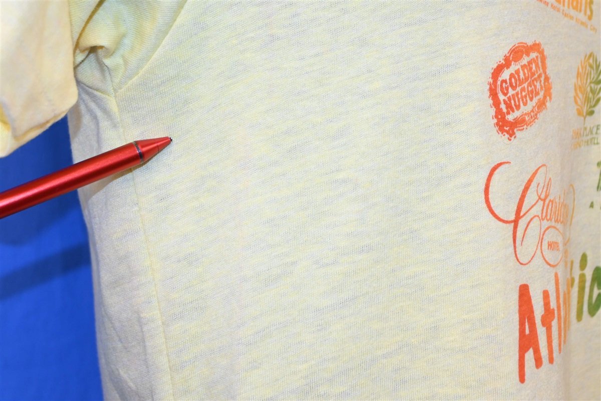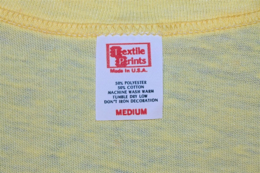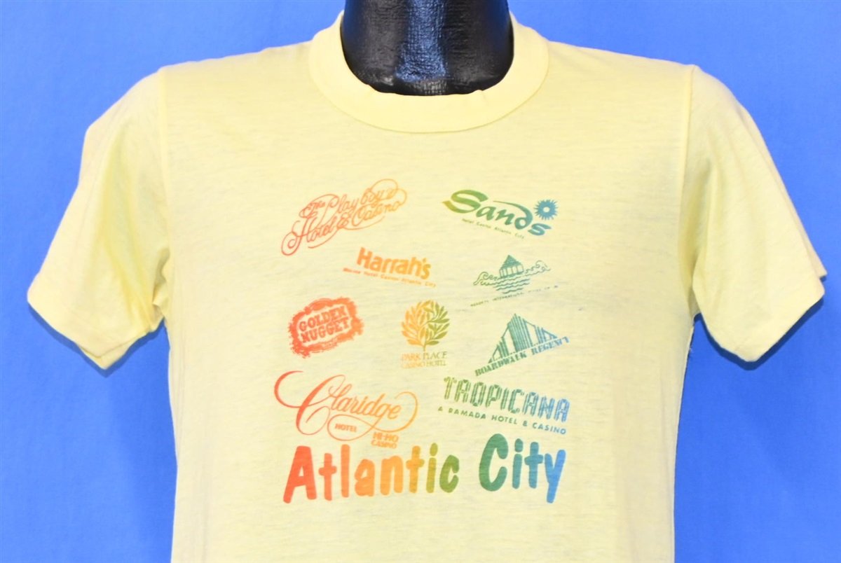 This great tee was made to promote the hotels and casinos in Atlantic City, New Jersey. The resorts featured on this tee are The Playboy Hotel & Casino, Sands, Harrah's, Boardwalk Regency, Golden Nugget, Park Palace, Tropicana and the Claridge Hotel. At the end of the 70s, Atlantic City became a hot gambling destination thanks to new laws.