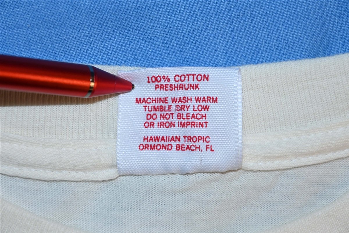 This sweet t-shirt promotes the brand Hawaiian Tropic. The brand was established in 1969 by Ron Rice. They make apparel for the company and their famous suntan lotion. The company has gained the title of the largest private manufacturer of sun care products in the United States.