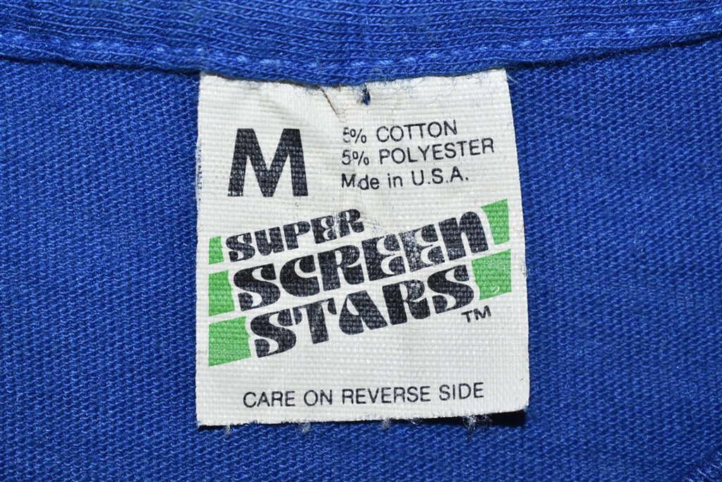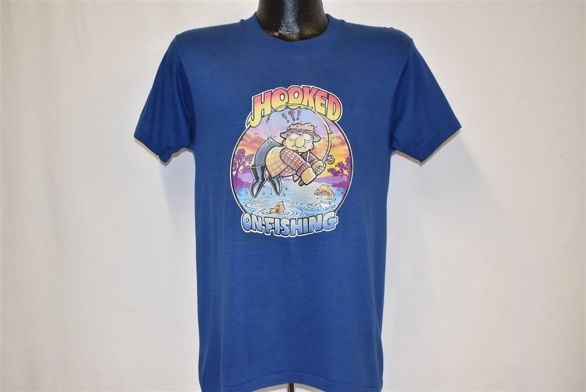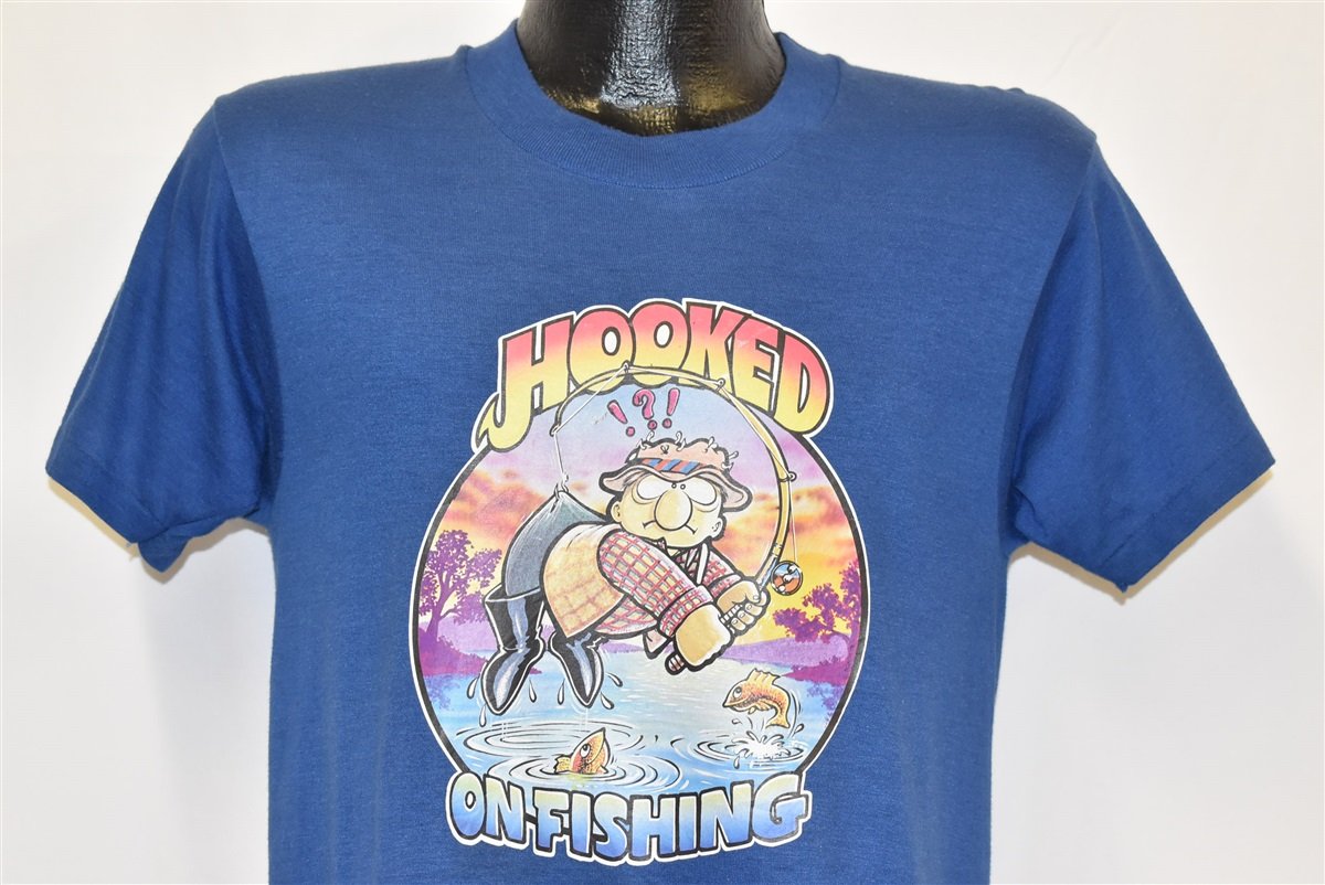 This vintage tee is the perfect Father's Day gift or birthday present for dad. It's a 1980s original featuring iron on cartoon graphics, soft poly cotton blend, and lots of old school charm. Fishermen and anglers will probably relate to the funny motto, "Hooked on fishing".