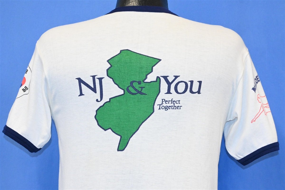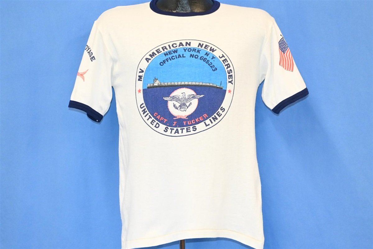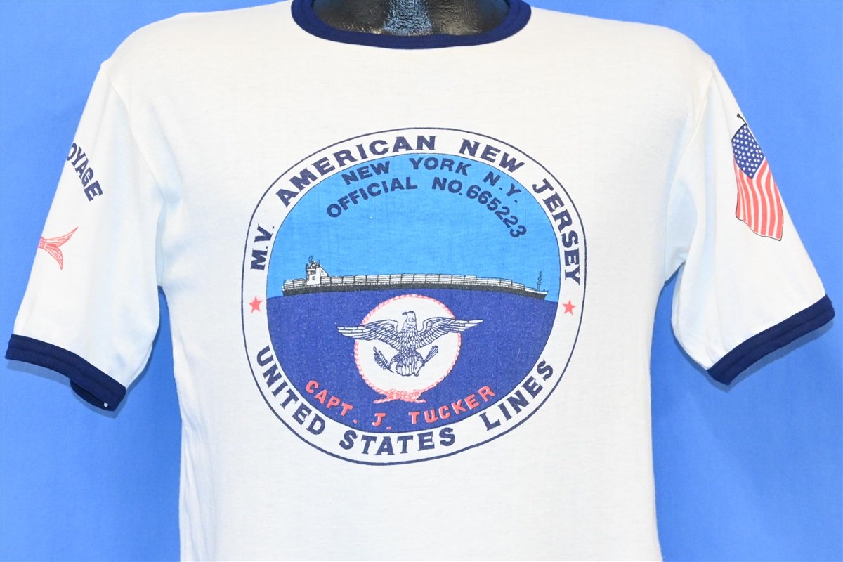 This cool vintage ringer was made to commemorate the maiden voyage of the American New Jersey, a container ship operated by United States Lines. United States Lines was originally created by the US Shipping Board and controlled by the Emergency Fleet Corporation. They operated German liners that were seized during World War I, before they became a private shipping company. This shirt highlights the captain of the ship, J. Tucker, and the back proudly reads, "NJ & You Perfect Together".