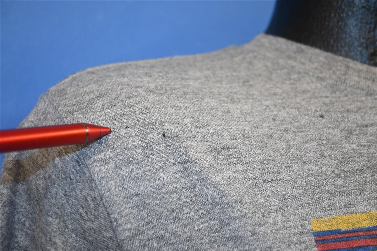 The tag says large but this shirt fits like a modern unisex adult medium. There are several small holes throughout, see pics.