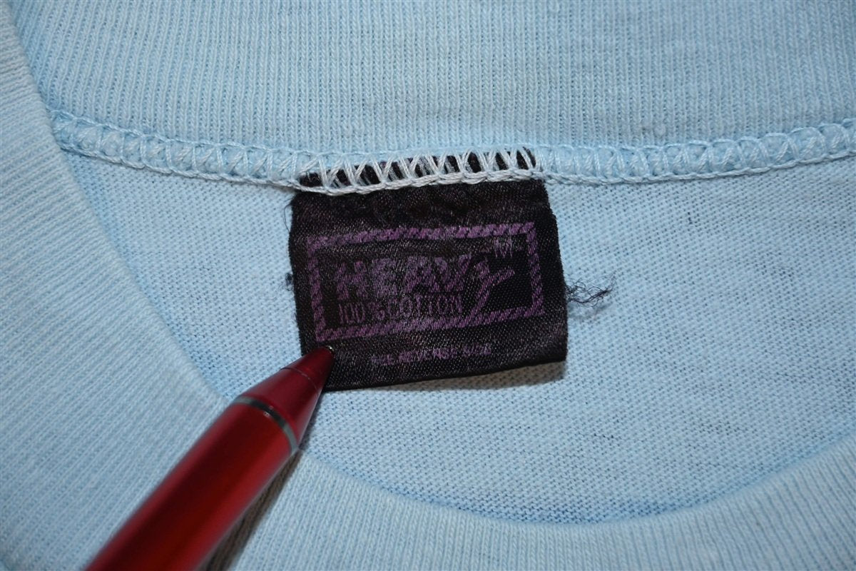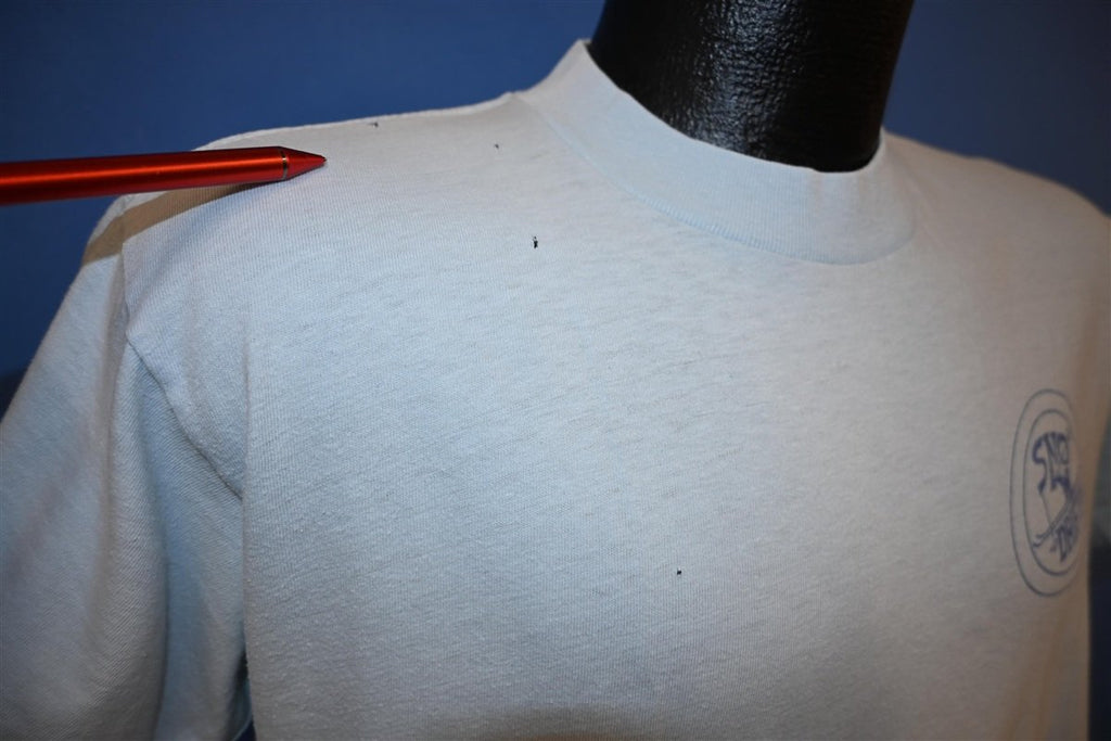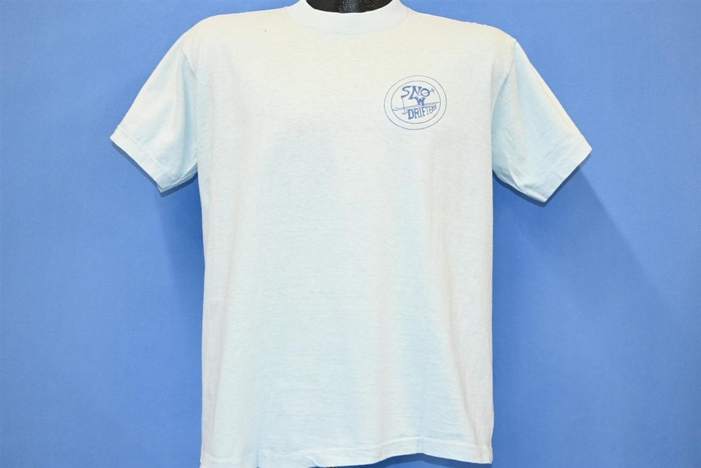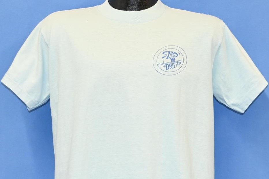 This cool double sided tee promotes a group called the Snow Drifters. There's not a lot of information on this shirt, but the name does match a winter ski and snowboard club based out of the San Francisco Bay Area. Founded in 1974, the Snow Drifters is a group for adult singles to share their love of skiing and other outdoor activities.