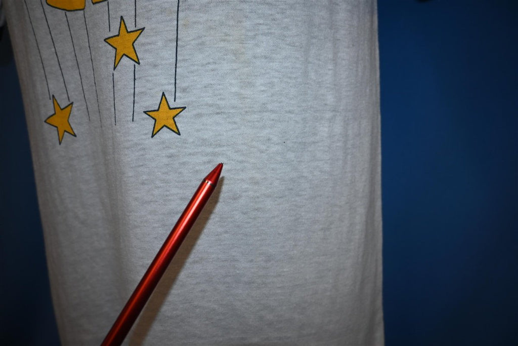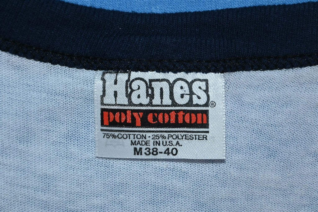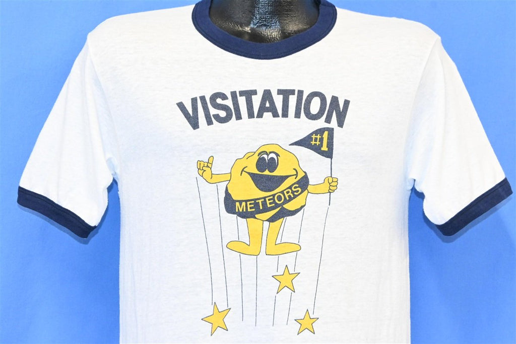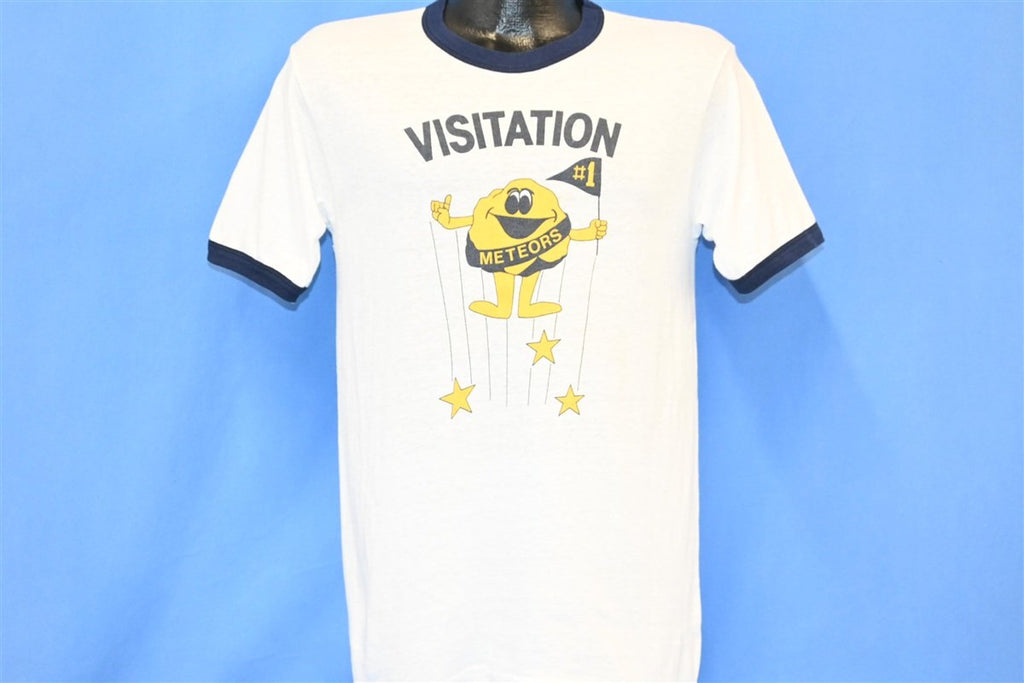 This sweet t-shirt celebrates the Visitation School Meteors. This shirt most likely was made for Visitation Elementary School in Los Angeles. Some records suggest that the Visitation School mascot was a meteor in the 1980s. Regardless, this shirt has a timeless ringer design, and it's made from a comfortable cotton blended material.