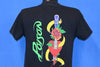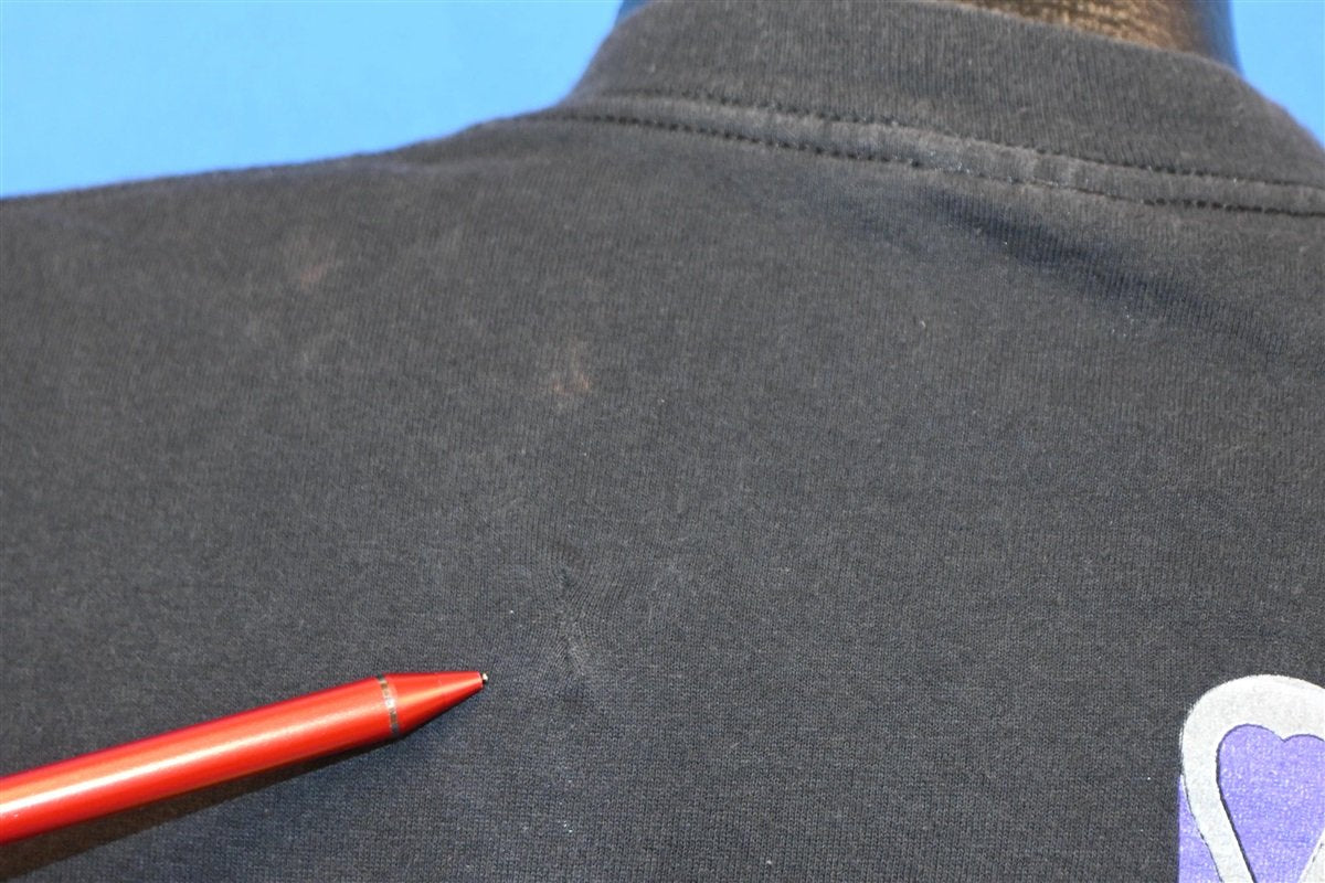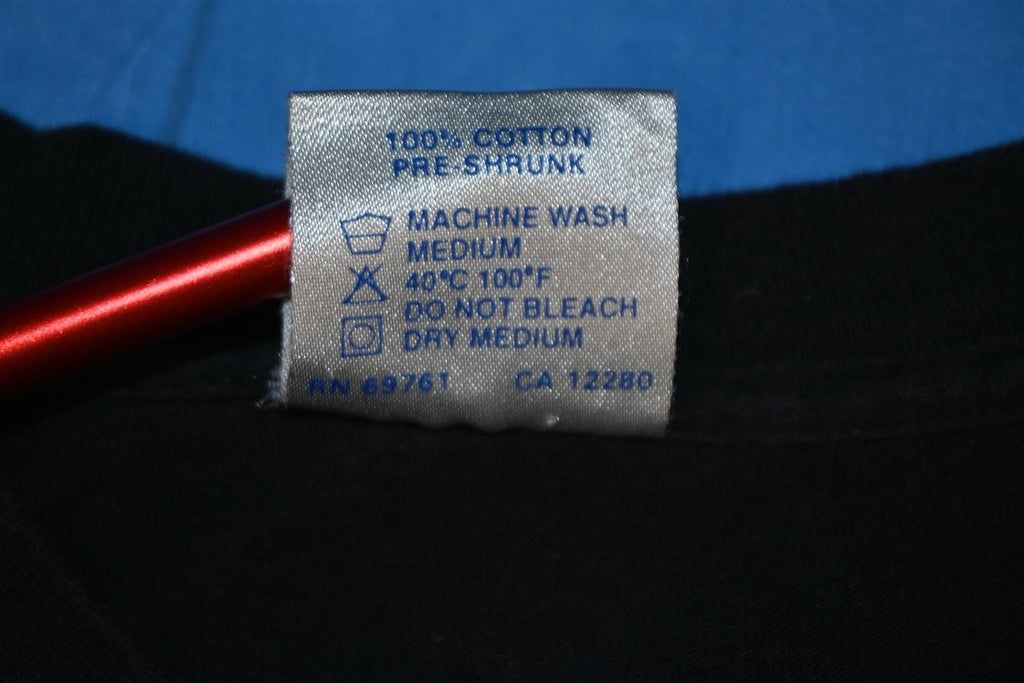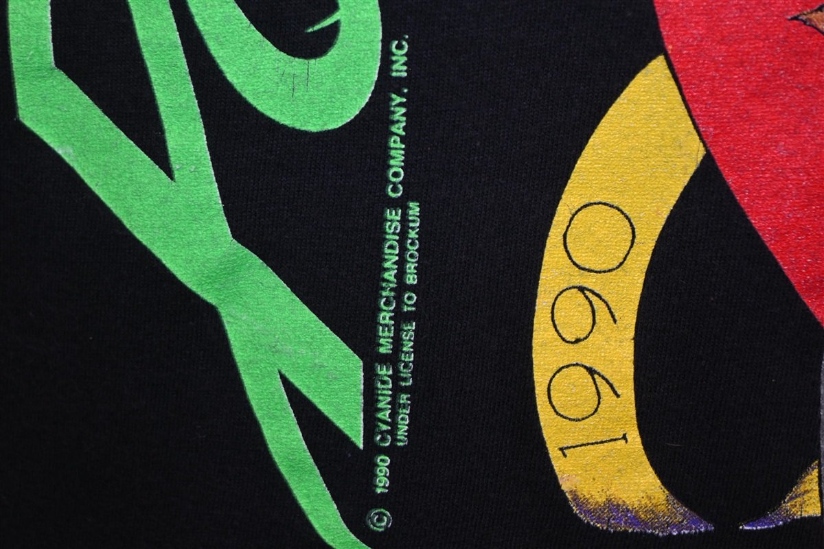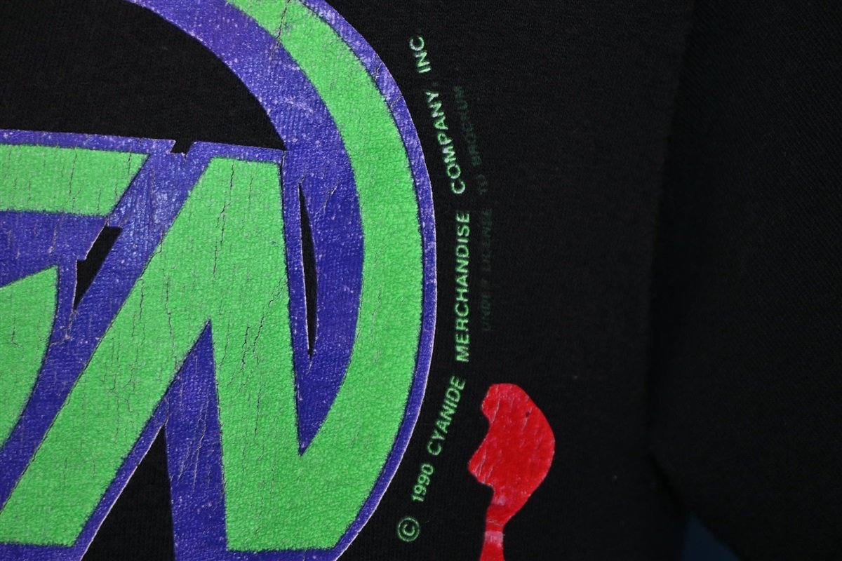 This sweet double-sided tee is for the band Poison, and it commemorates the group's promotional tour for the album Flesh & Blood. This was the band's third studio album, and it peaked at the number two spot on the Billboard 200. Flesh & Blood wound up being the band's third multi-platinum selling album in a row, and it featured several popular singles including the top ten hits "Unskinny Bop" and "Something to Believe In".