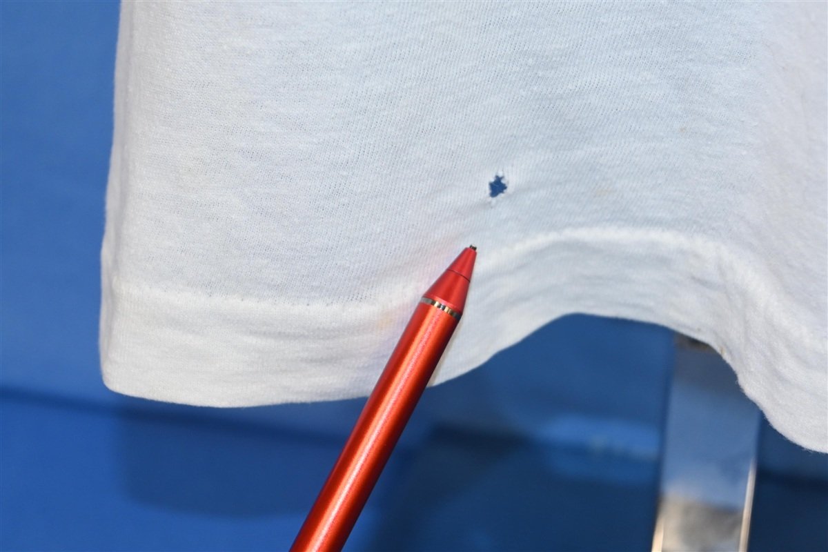 Fits like a modern unisex adult medium. There is a small hole on the front and some light spots throughout, see pics.
