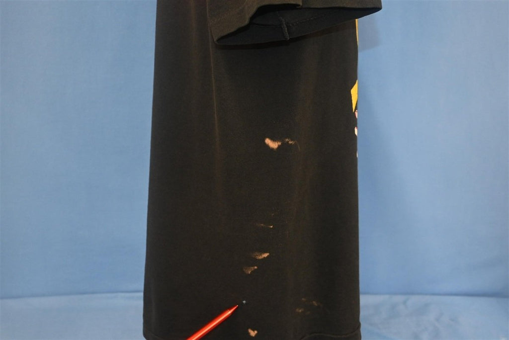 Fits like a modern unisex adult medium. There are some holes and some bleach spots along the side, see pics.