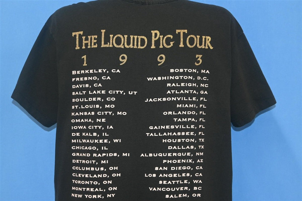This awesome shirt is for the band Primus from their Liquid Pig Tour. This tour was launched in the early 90s to promote the band's latest release, the 1993 album Pork Soda. According to lead singer Les Claypool, the title was intended to be a nod to the band's niche appeal, and he described the group as "an acquired taste, like a meat-flavored soda". Despite these claims, the album breached the top ten of the Billboard 200 and would eventually achieve platinum status.