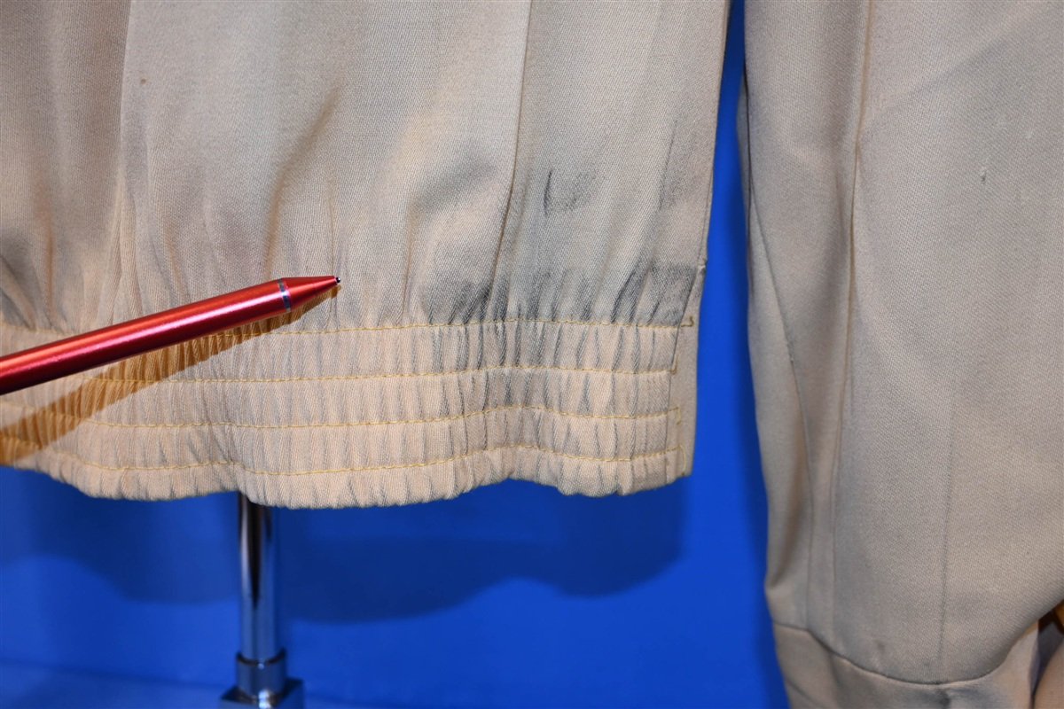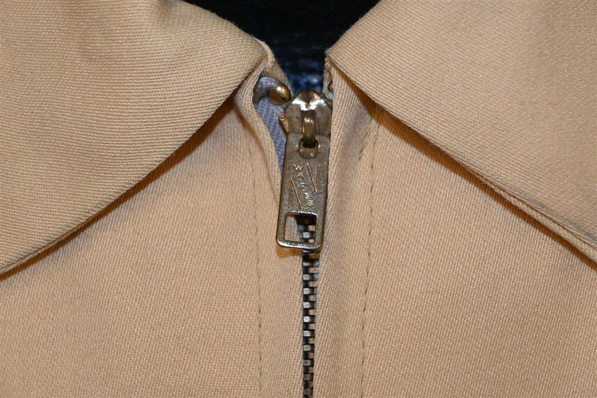 This amazing vintage jacket was made all the way back in the 1950s, and it features a zipper closure, padded shoulders, and multiple embroidered patches. Judging by the patches, this jacket once belonged to an avid fishing enthusiast. It's also made from a gabardine fabric, and the material's waterproof qualities would have made it ideal for anglers.