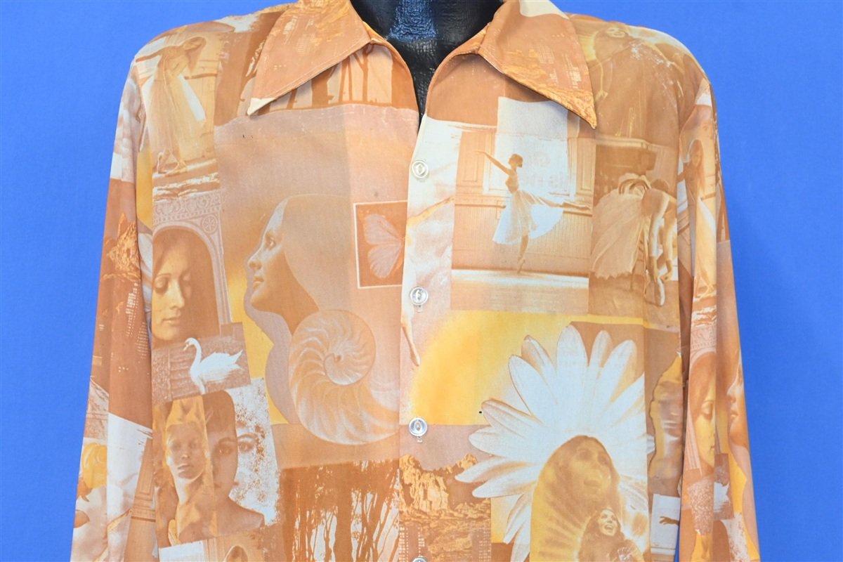 This amazing vintage button down is an authentic disco shirt from the 70s. It rocks a 70s style big collar, and an incredible collaged print of different vintage photographs. The combination of portraits and organic shapes makes for a super unique and psychedelic pattern.