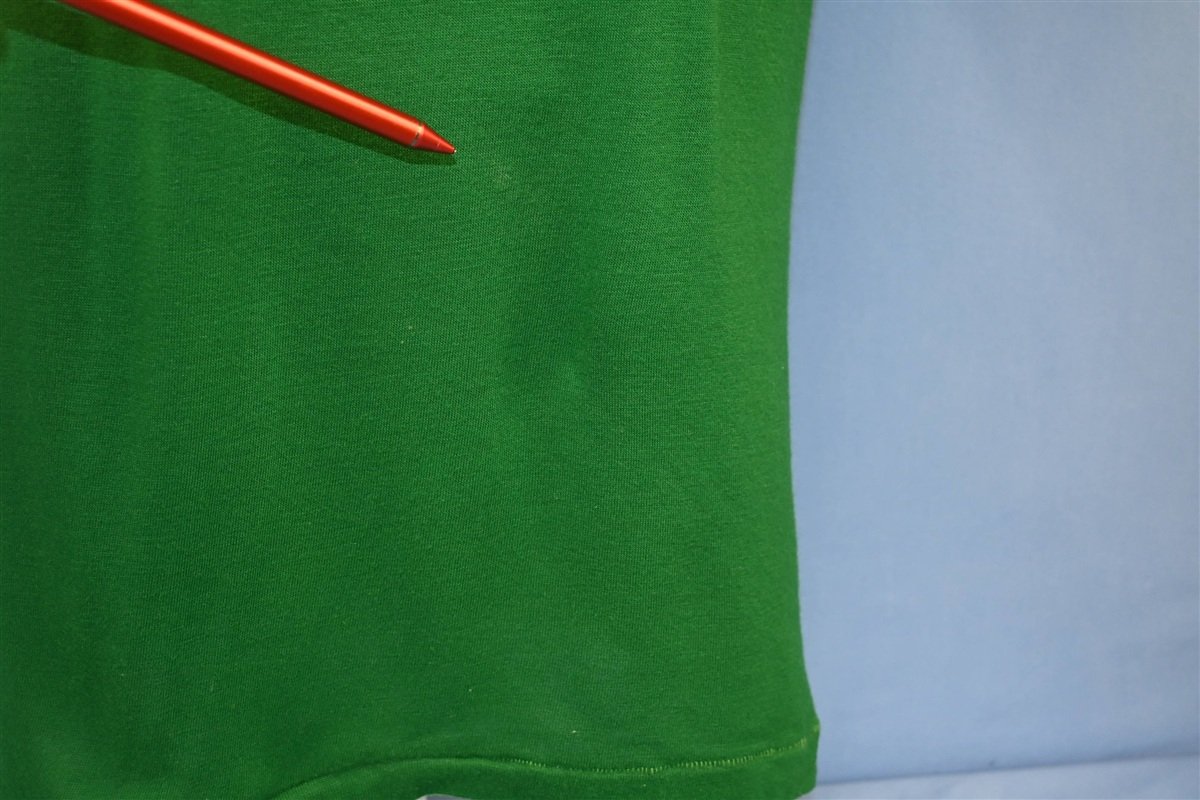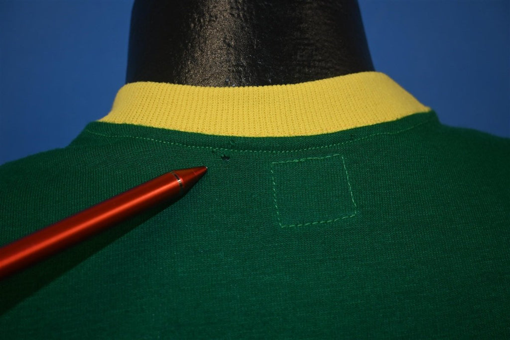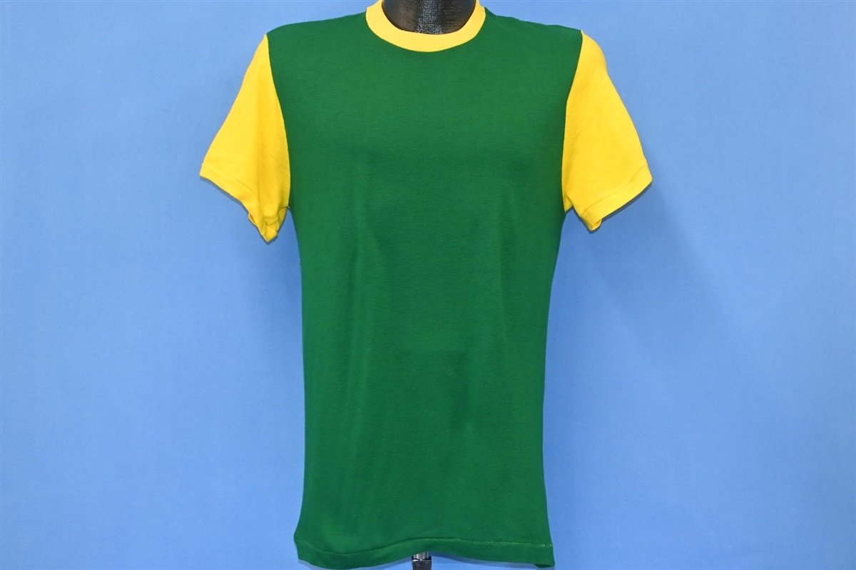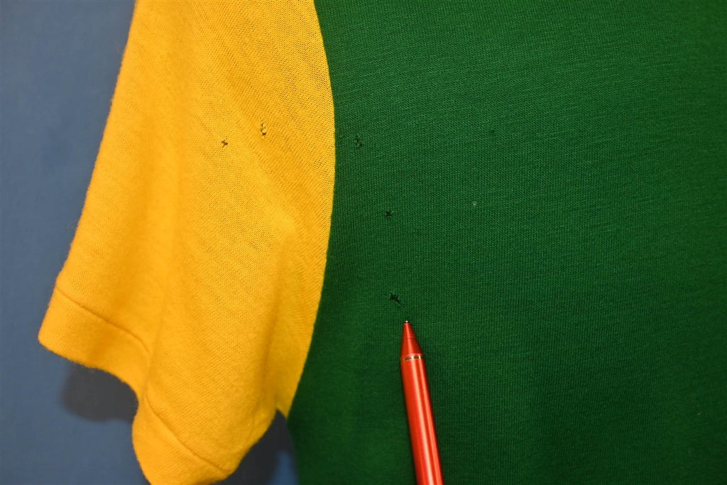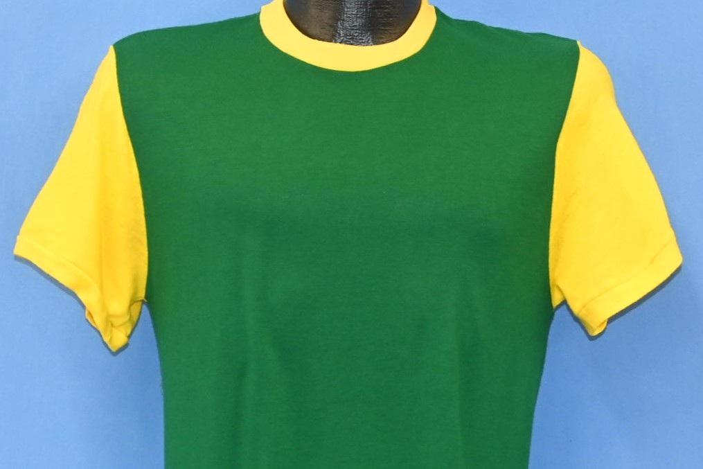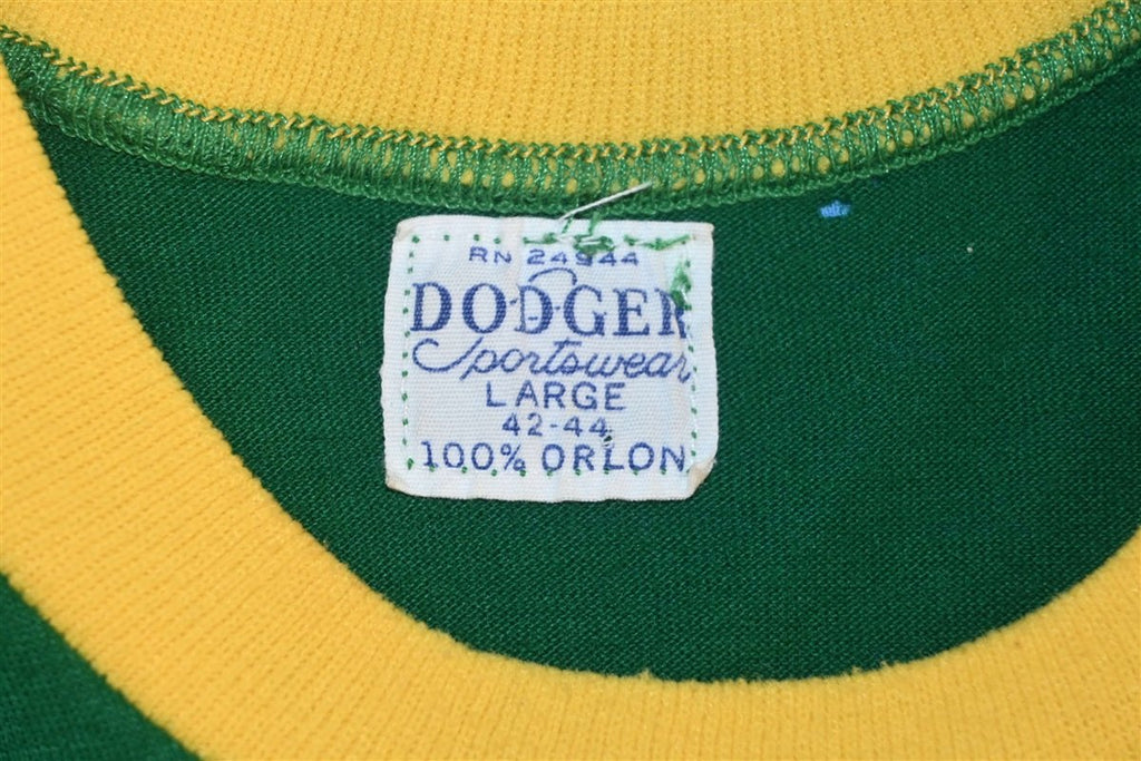 This sweet vintage jersey was made back in the 70s by Dodger Sportswear. Dodger was founded in the late 50s, and by the 70s they had established themselves as a respected manufacturer of custom athletic apparel. This shirt represents a classic Dodger tee, and it's totally blank without any graphics on the front or back. The shirt reps the colors green and gold, and its made from the company's signature soft orlon acrylic fabric.