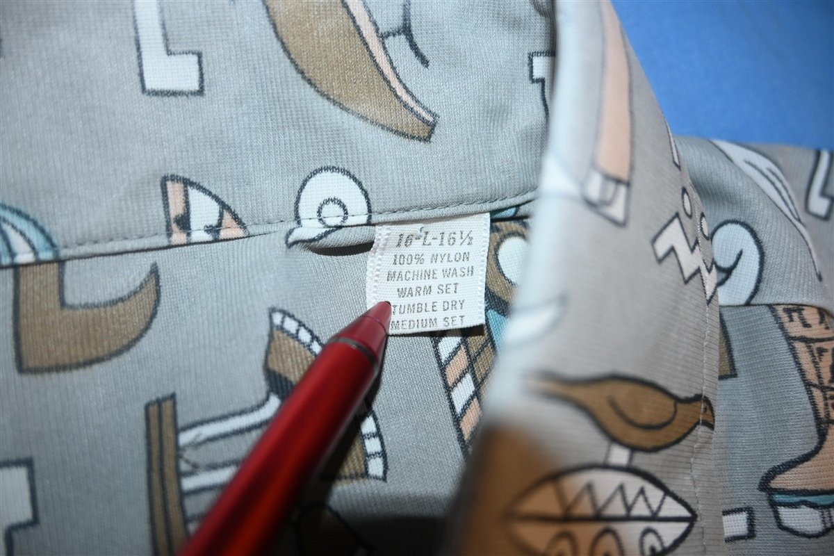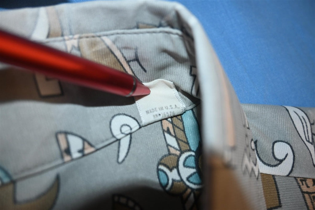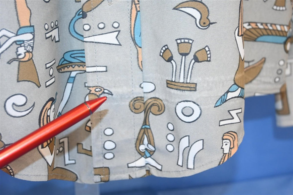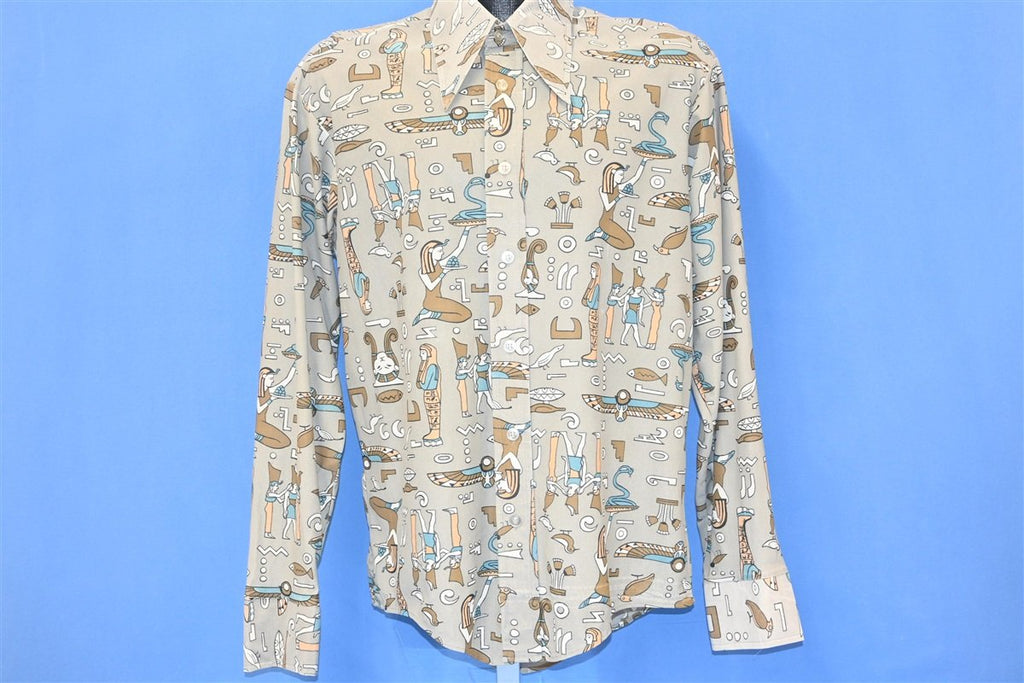 This incredible button down has a unique novelty print inspired by ancient Egyptian hieroglyphics. This button down is a classic disco shirt from the 70s, and it features the signature big style collar of the decade. Public interest in Egyptology surged significantly in the 70s, and this sudden boost in popularity was largely thanks to the traveling "Treasures of Tutankhamun" exhibit, which toured the nation during the latter half of the decade. The exhibit drew millions of visitors and it sparked a wave of art and fashion inspired by Ancient Egypt.