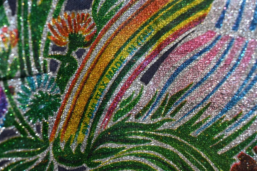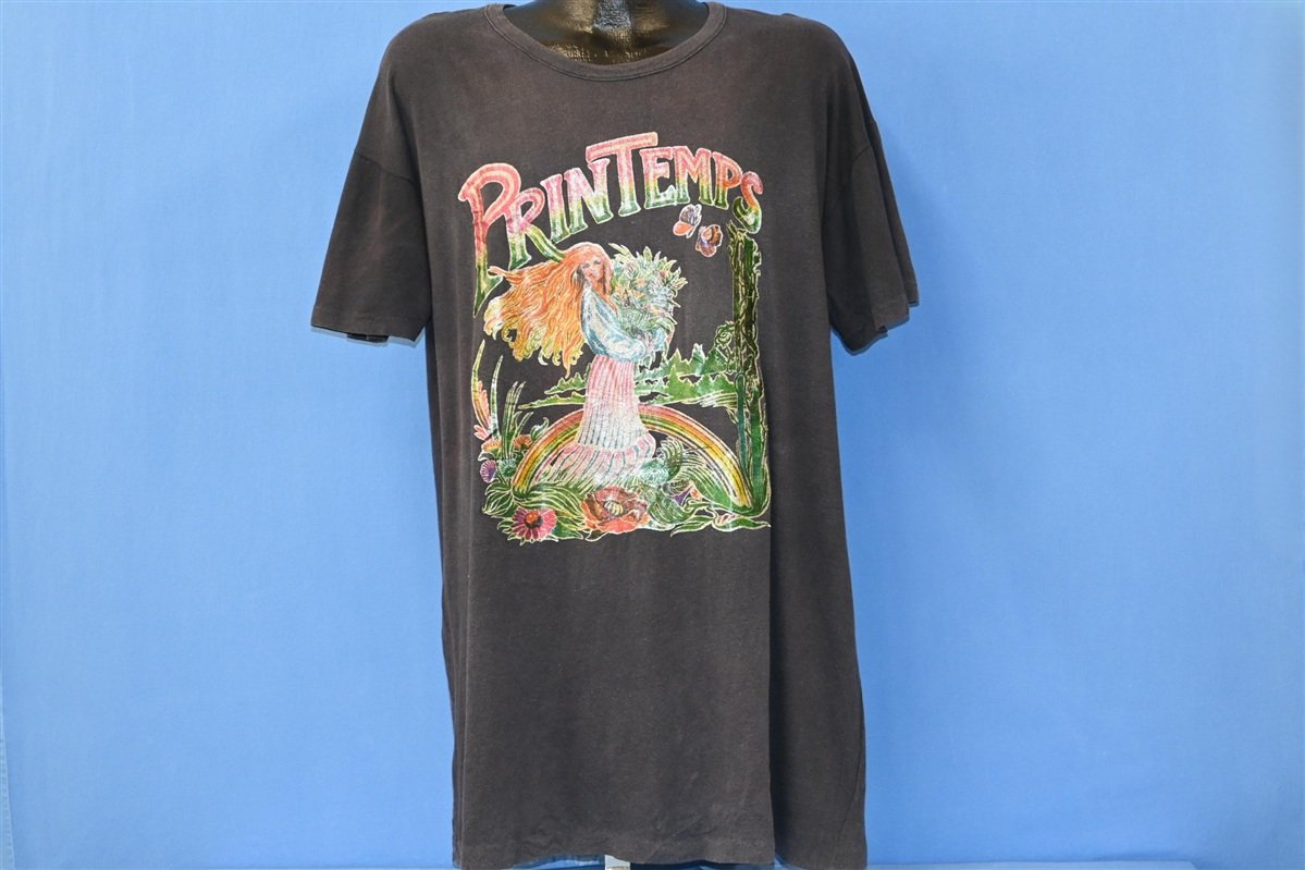 This cool shirt has a beautiful iron on graphic of a woman surrounded by a field of colorful spring florals. Above the image is the word "Printemps" which is the name of a chain of French luxury department stores, but it also is the French term for spring. The iron on is also full of sparkling glitter, and it evokes the style of art nouveau illustrators like Alphonse Mucha and Henri de Toulouse-Lautrec.