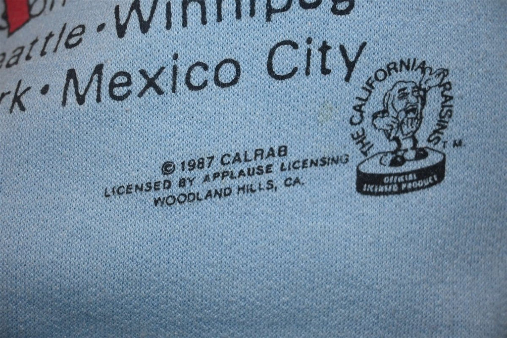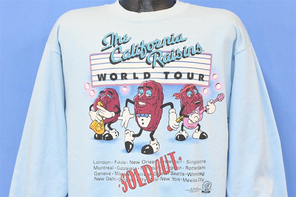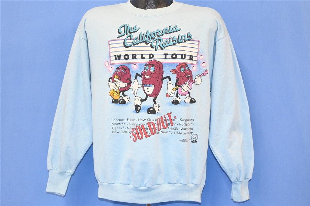 This sweet sweatshirt celebrates the fictional music group the California Raisins, and it advertises a sold out world tour. The California Raisins were an animated band of anthropomorphized raisins, that was developed to help sell the Sun-Maid brand. While the band may have been fictional, they did produce some very real hits. The raisins released four studio albums in the late 80s and they became best known for their cover of "I Heard It Through the Grapevine". For most of their discography, lead vocals were provided by a former member of Electric Flag and Jimi Hendrix's Band of Gypsys, Buddy Miles