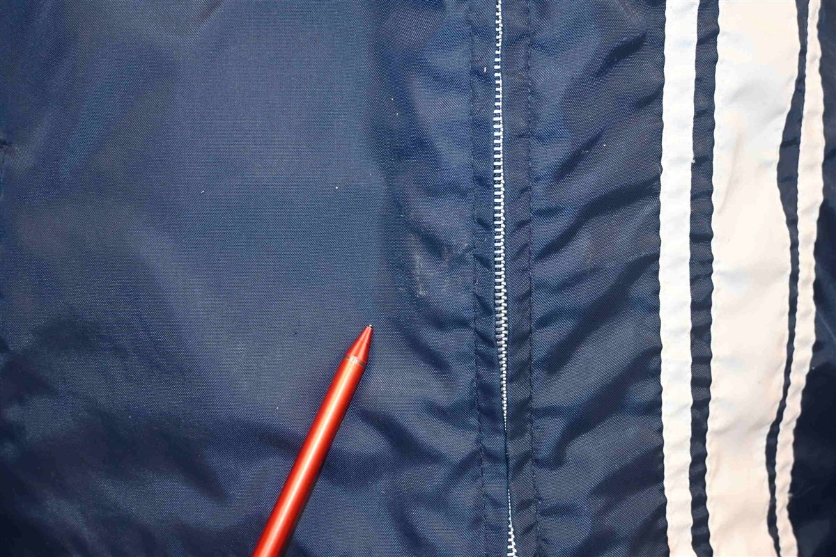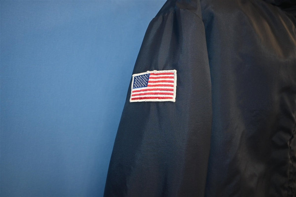 This sweet racing jacket was made in the 80s, and modeled after the jackets worn by the Shelby Cobra racing team. The jacket comes in a rich shade of navy blue and features embroidered patches that rep the logos for the Ford Motor Company and the Shelby Cobra. This jacket has a zipper closure that goes all the way up to the chin, and a fleece lined interior, making it a cozy choice for staying warm at the track. It also features two hand pockets and a cigarette pocket on the sleeve.