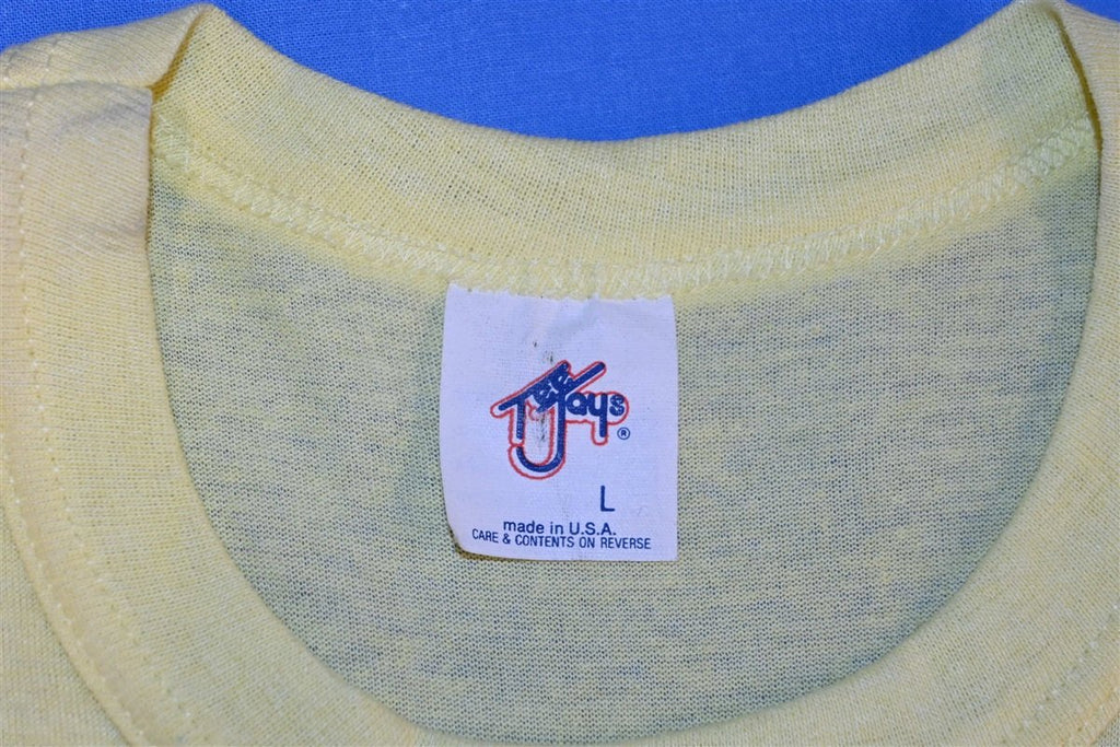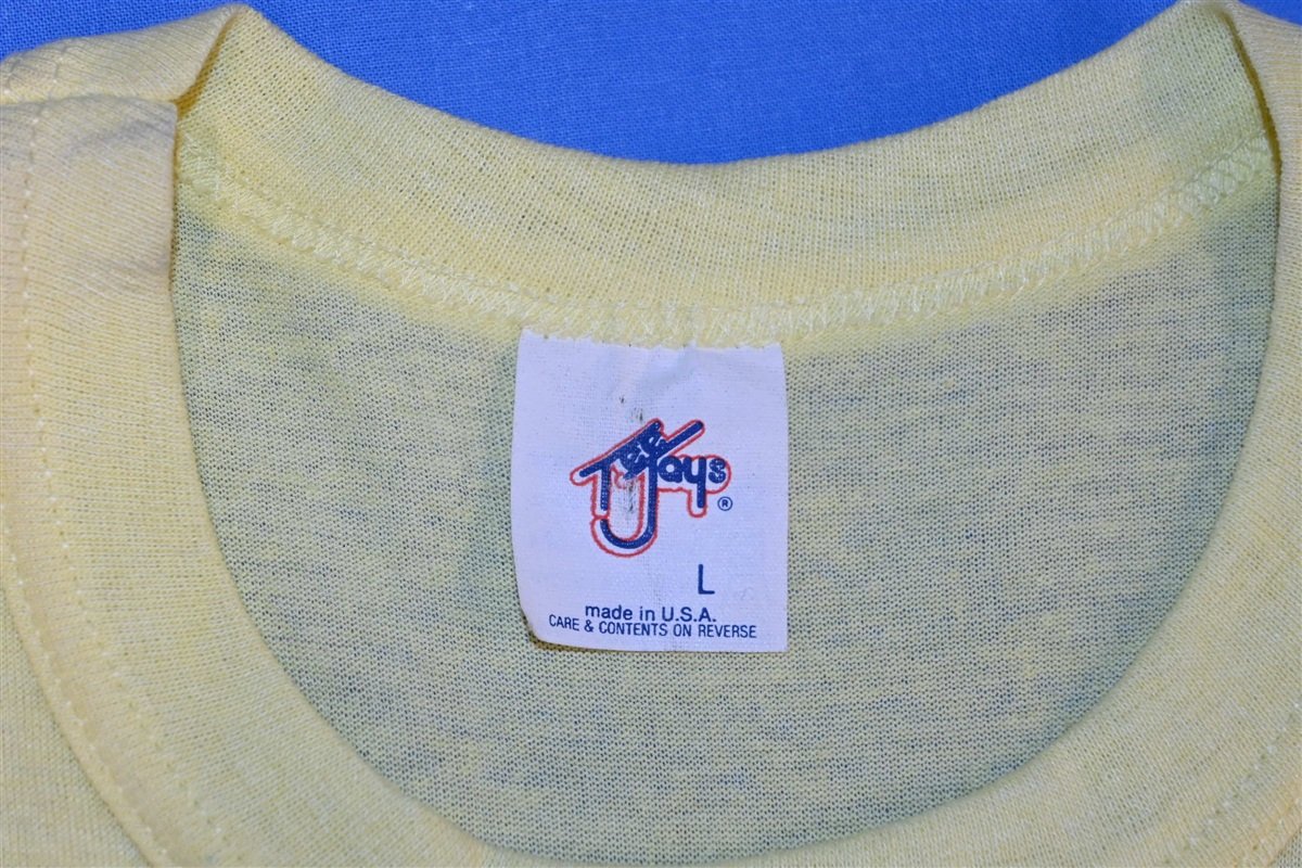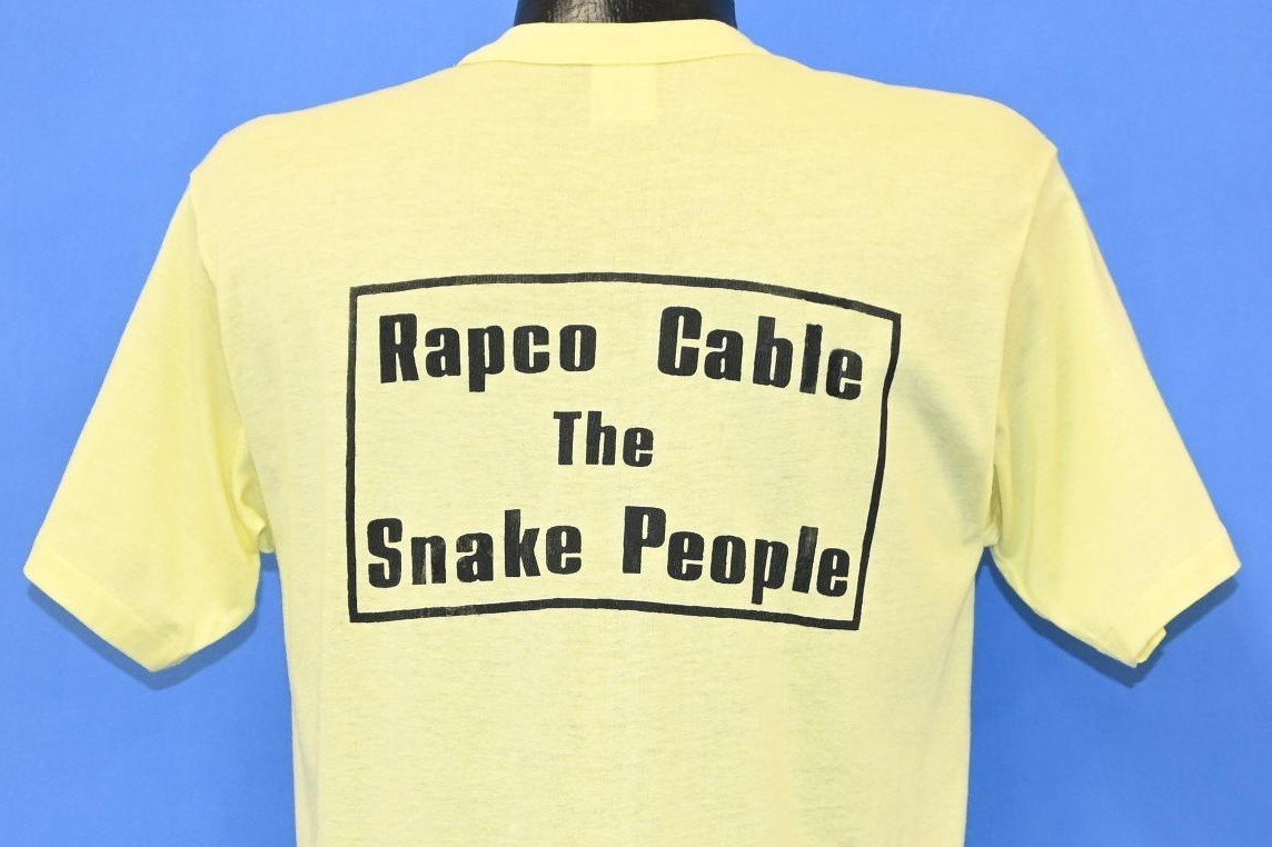 This cool double sided shirt promotes Rapco, a cable and lighting company that was founded in Jackson, Missouri in the 80s. Since their founding, Rapco has grown into one of the world's largest cable suppliers, and their inventory includes products for audio, video, data, and telecommunications. This shirt jokingly refers to the company as "the snake people" in honor of their trusted cable snakes designed for bundling multiple signals. The front even features a graphic of a literal cable snake with numerous input ports and a tail full of rattling connectors.