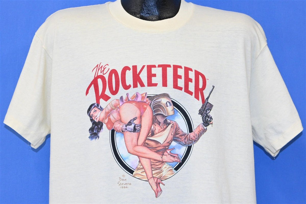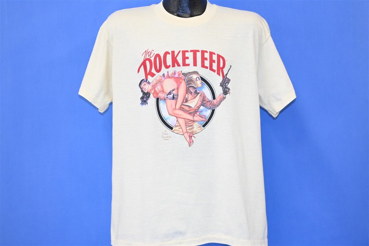 This awesome shirt features the Rocketeer, an epic comic book superhero from the mind of Dave Stevens. Inspired by heroes of old Saturday matinee serials of the 30s, 40s, and 50s, the character first appeared in a 1982 issue of Pacific Comics' Starslayer. The positive response to this first appearance then led to the Rocketeer being showcased in an anthology comic called Pacific Presents. After the collapse of Pacific Comics, he also appeared in titles from Eclipse, Comico, Dark Horse, and IDW Publishing. After selling the film rights in 1983, The Rocketeer was also given a movie adaptation in 1991 from Walt Disney Pictures.