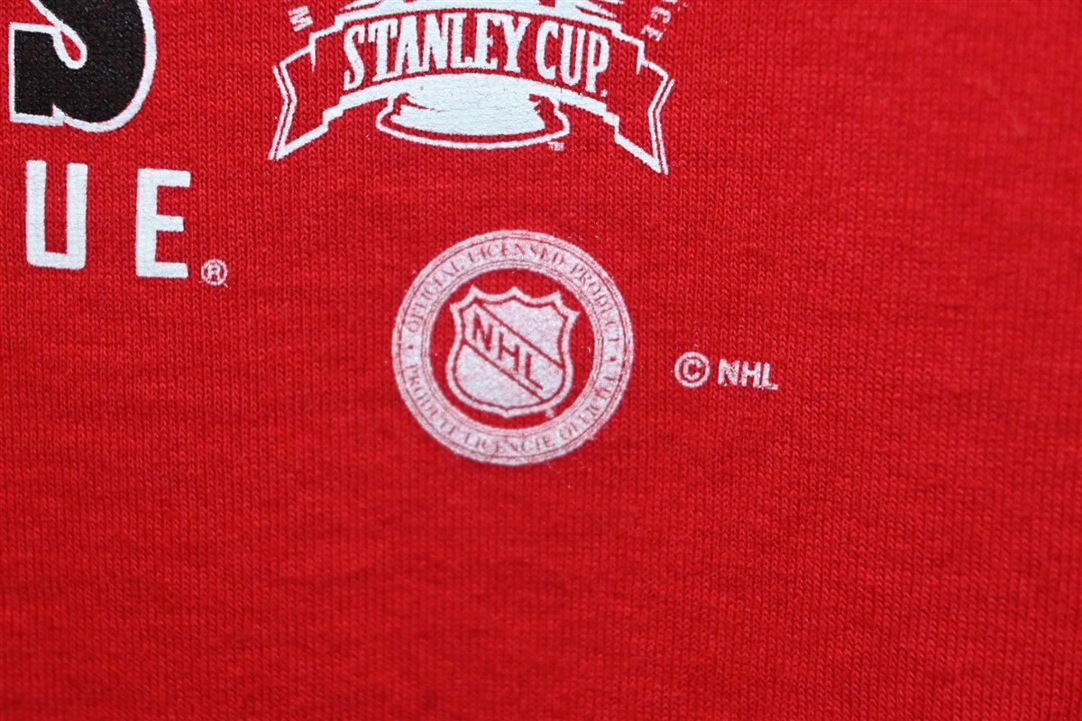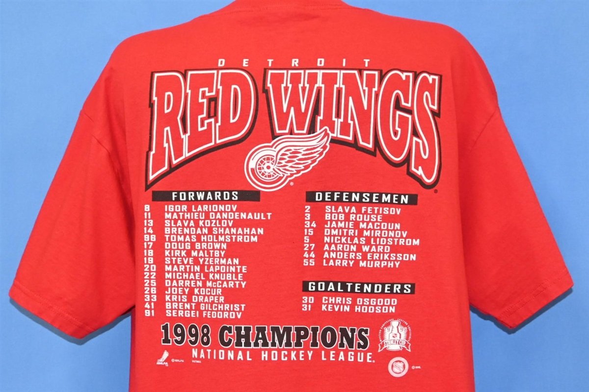 This sweet double sided shirt celebrates back to back Stanley Cup victories for the Detroit Red Wings. In 1997, the Red Wings swept the Philadelphia Flyers in the Stanley Cup Final, earning the team their first NHL Championship since 1955. The following year Detroit successfully defended their championship title against the Washington Captials, securing the Red Wings their ninth Stanley Cup in franchise history.