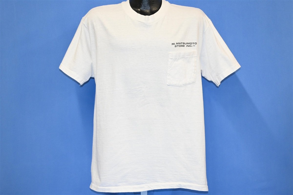 This sweet pocket tee promotes the famous M. Matsumoto Grocery Store located on the Hawaiian island of Oahu. Established in the 1950s, Matsumoto's was a small family-owned shop that grew into a beloved local icon. The magic began when owners Mamoru and Helen Matsumoto began offering the Japanese treat of shave ice, and over time people began lining up down the block just to purchase the frozen delicacy. The back of this tee features a graphic drawn by another Oahu local, Paul Gemeno and it refers to another popular Hawaiian dish, pupu and beer.
