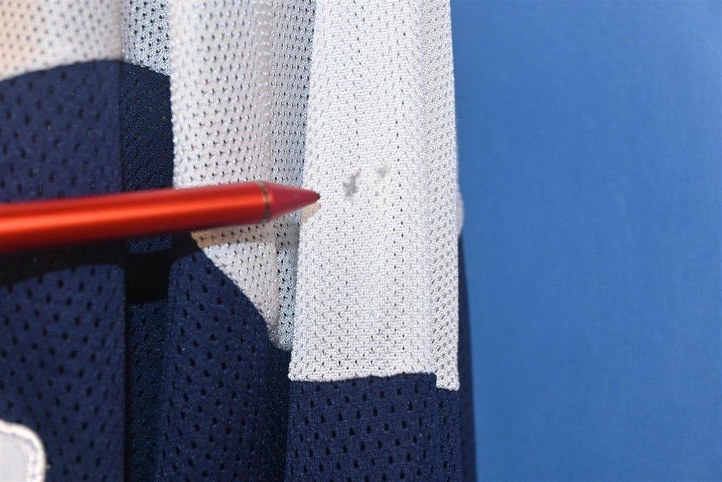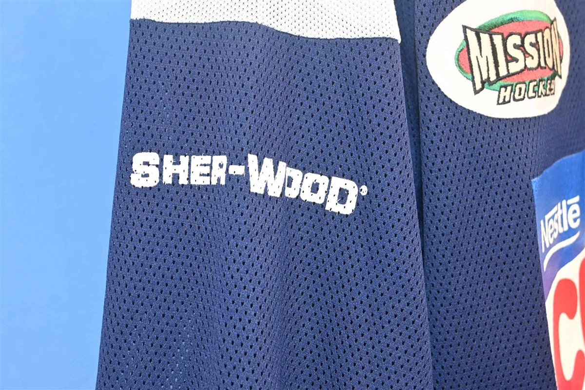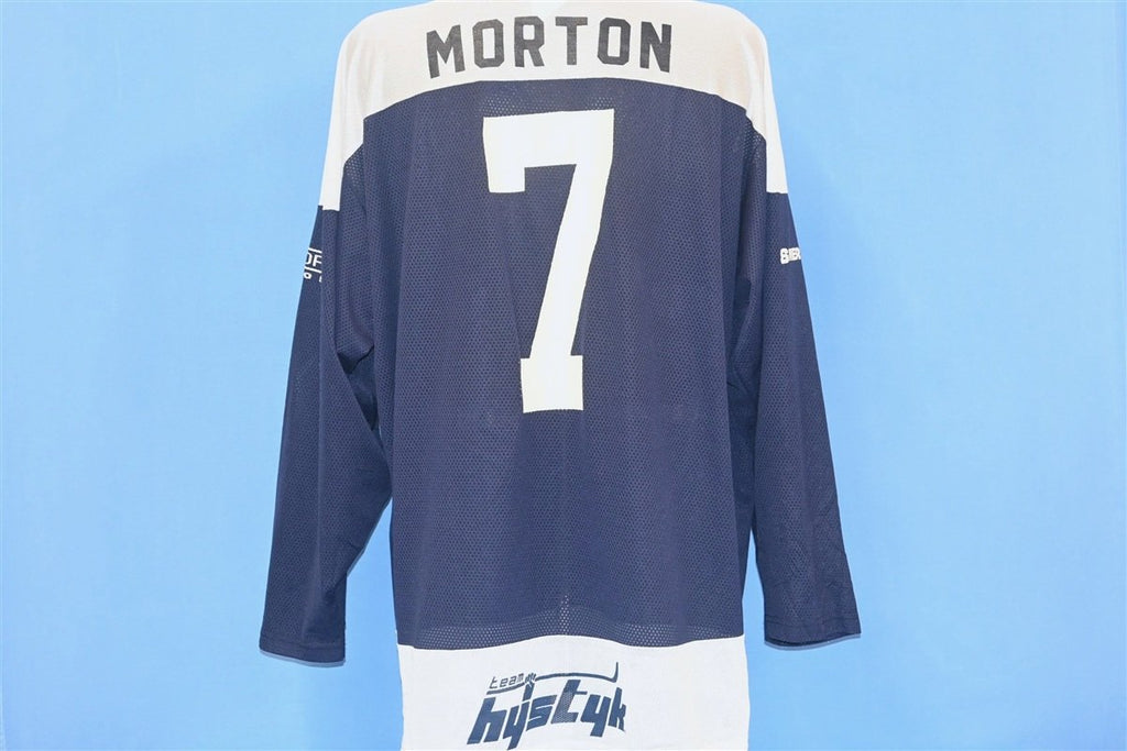 This jersey reps the number seven and has the name "Morton" on the back. It's also decorated with various team sponsors that include Nestle Crunch candy bars, Mission Hockey, Priority Records, Sher-Wood, and the Bud Ice NHL campaign.