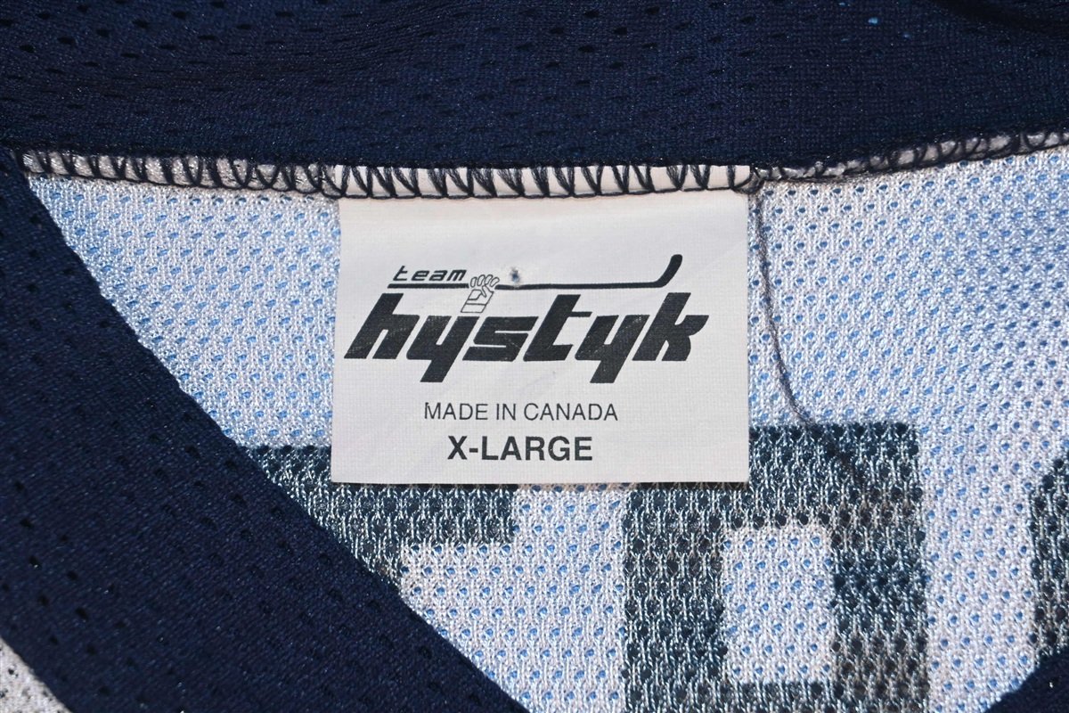 This cool vintage hockey jersey was made in the 90s to represent Team Hystyk. Team Hystyk was a women's inline hockey team based out of British Columbia, Canada. They competed in the 1997 USA Hockey InLine Cup and nearly won the National Championship, but ultimately lost the final game to the Toronto Typhoon.
