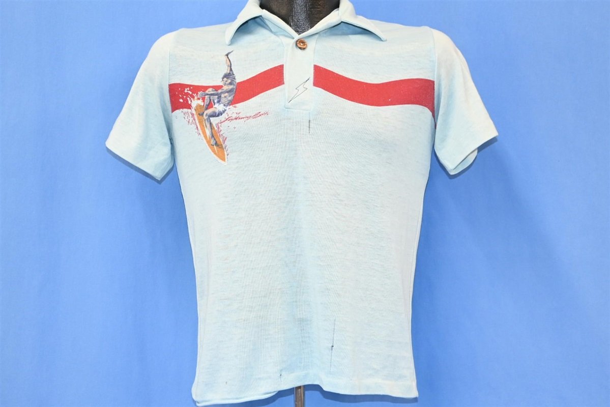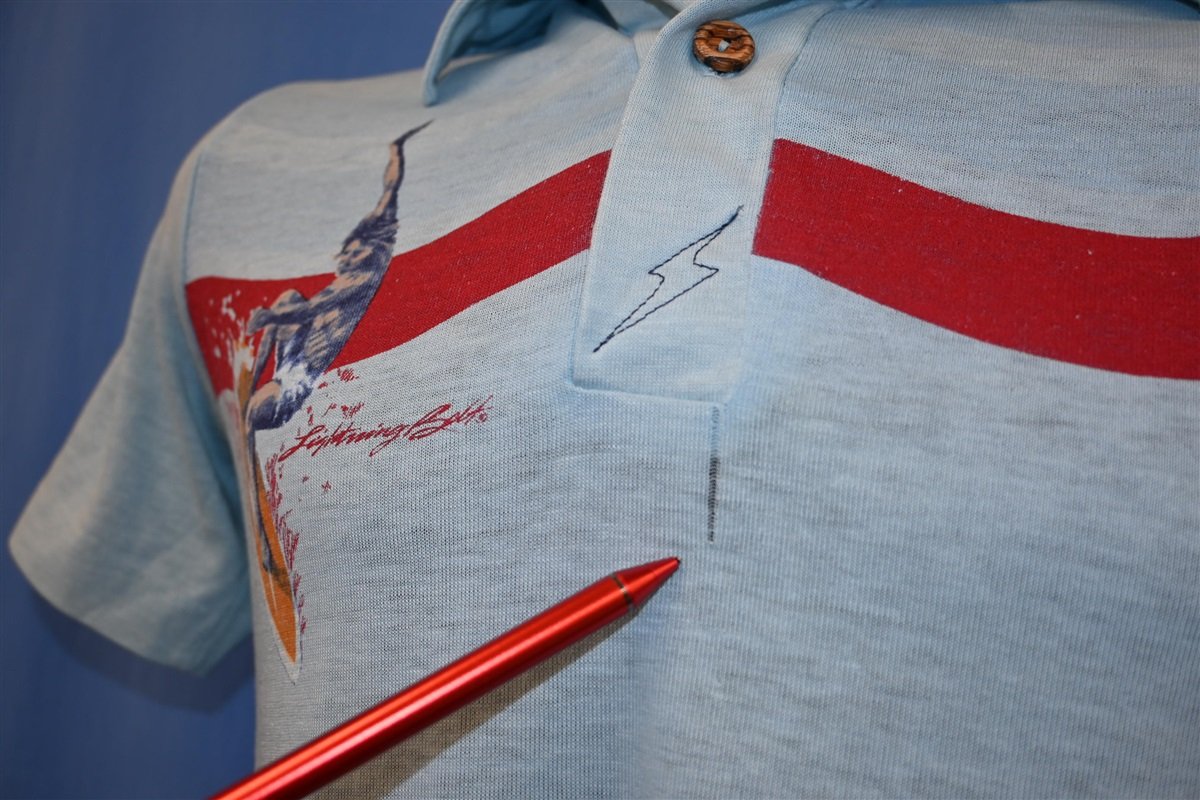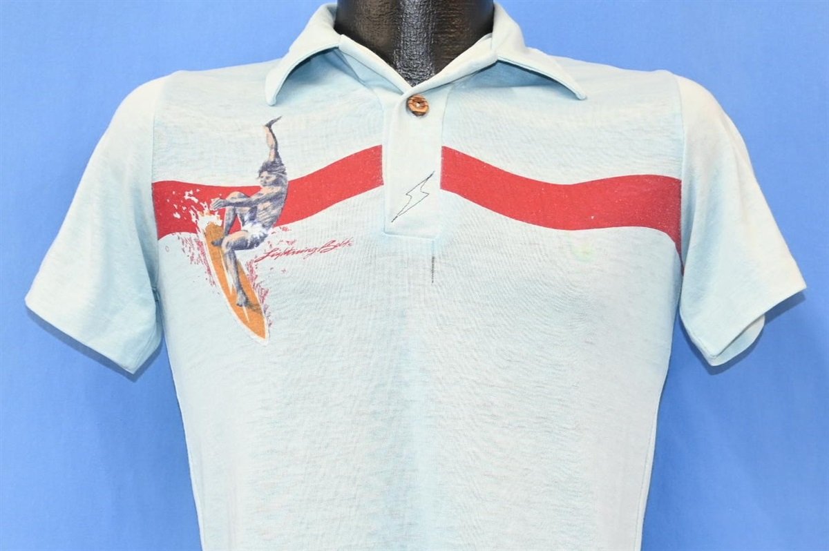 This awesome vintage polo was made for surfers. This shirt was made in the 70s and it has the logo for Lightning Bolt Surfboards sewn into the placket. This shirt also has a cool striped design that shows off a surfer next to the name Lightning Bolt. Lightning Bolt was one of the hottest board companies to emerge out of the 70s surf scene, and they began producing stylish apparel such as this around the middle of the decade.