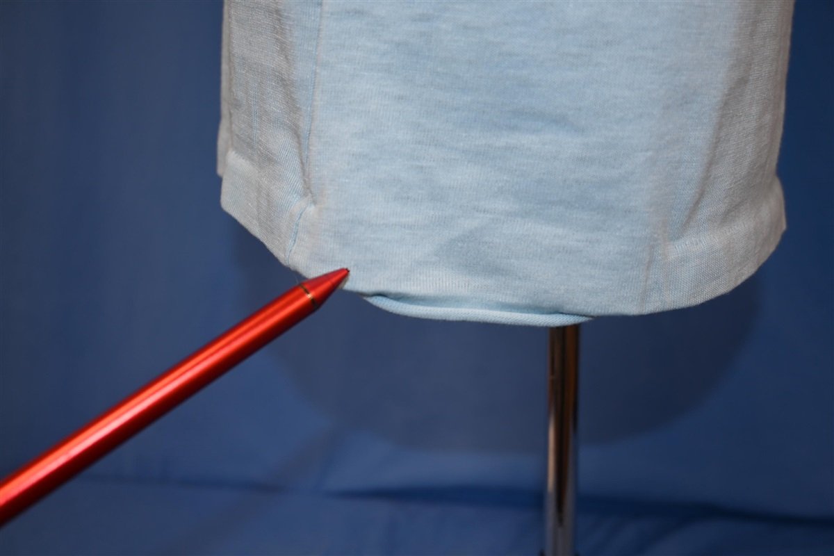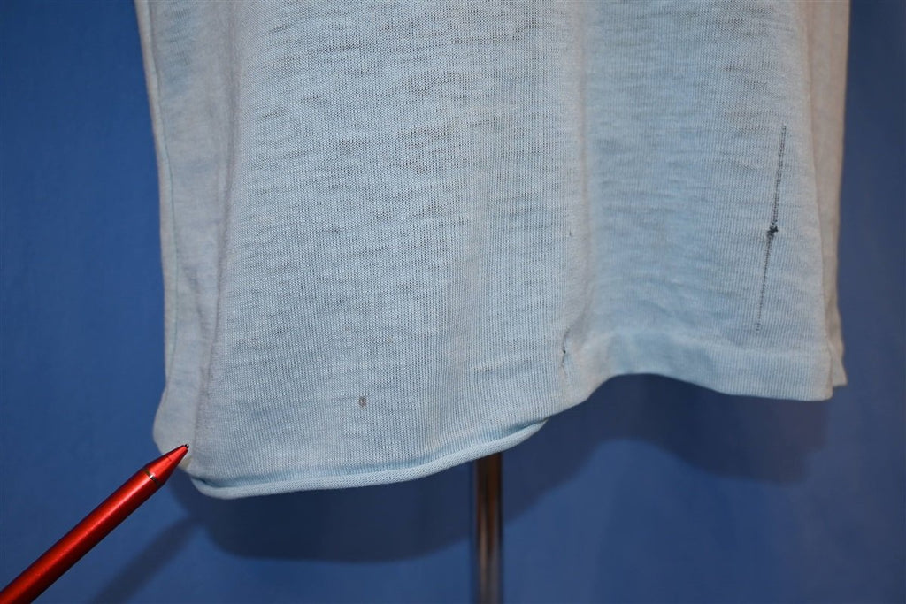 Fits like a modern unisex adult medium. This shirt is short, please double check measurements. There is a small run on the front and the bottom seams are busted, see pics.