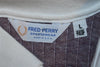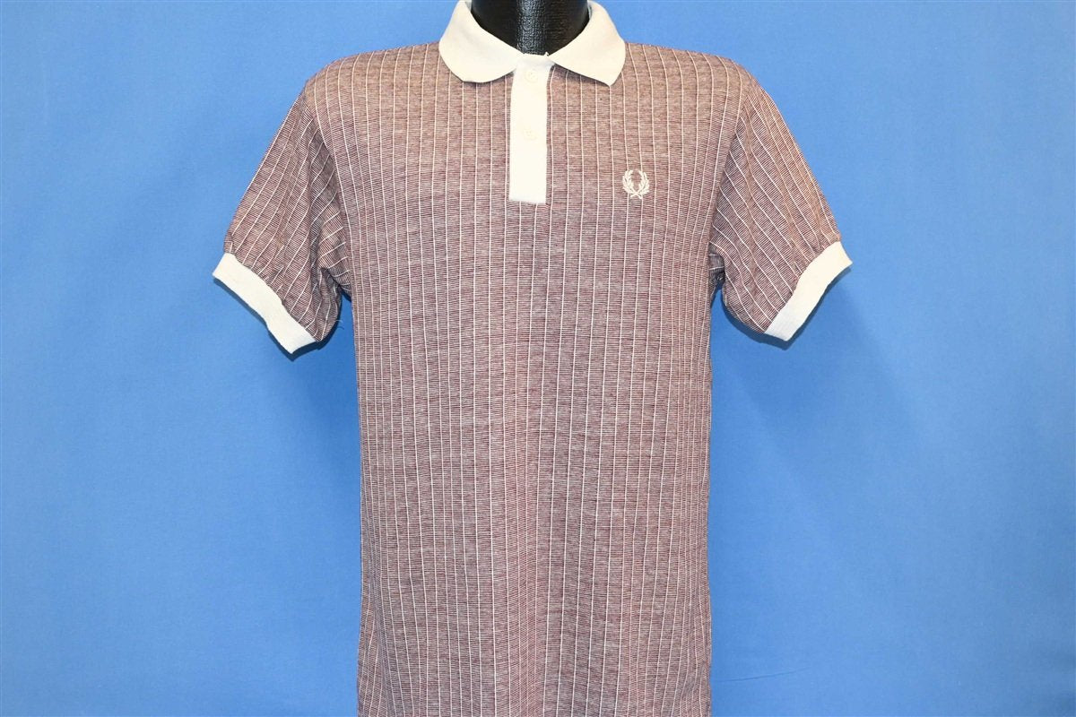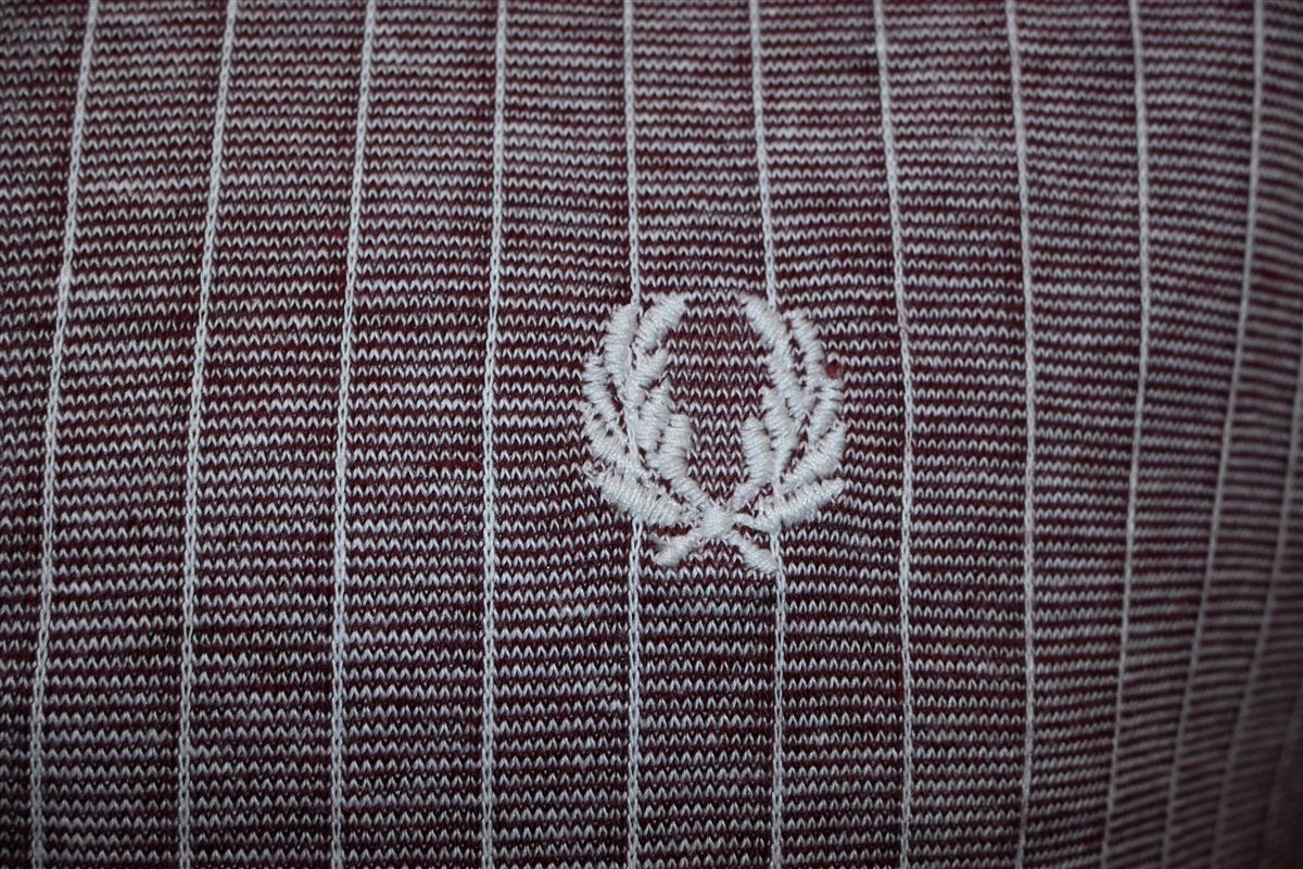 This timeless polo shirt was made by the brand Fred Perry, which was founded by the world No. 1 tennis player of the same name. This shirt features the company's logo, a laurel wreath in honor of the Wimbeldon tournament, embroidered onto the chest. For decades the company has been famous for their classic tennis shirts, however unlike most Fred Perry clothing, which is traditionally produced in Leicester, UK, this shirt was made in the USA in the 80s. This shirt features a two-tone knit design, that involves white and maroon stripes. It also has a white, rib-knit collar and two button closures.