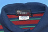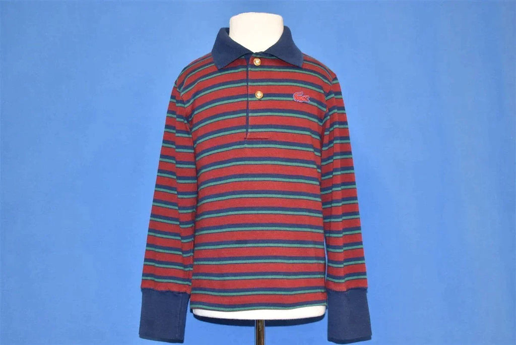 This kid's polo shirt was made back in the 80s by Izod and it features the classic Izod Lacoste crocodile logo embroidered onto the chest in red. The shirt has long sleeves and comes in a handsome maroon color. It features horizontal blue and green stripes and a navy blue two button collar that matches the stripes and cuffs.