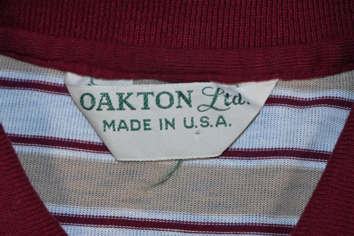 This stylish vintage polo was made by a clothing company that used to be active in the 80s and 90s called Oakton Limited. The shirt has a lovely horizontal striped pattern and a maroon collar and cuffs. It also has tennis tails along the sides.