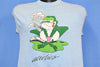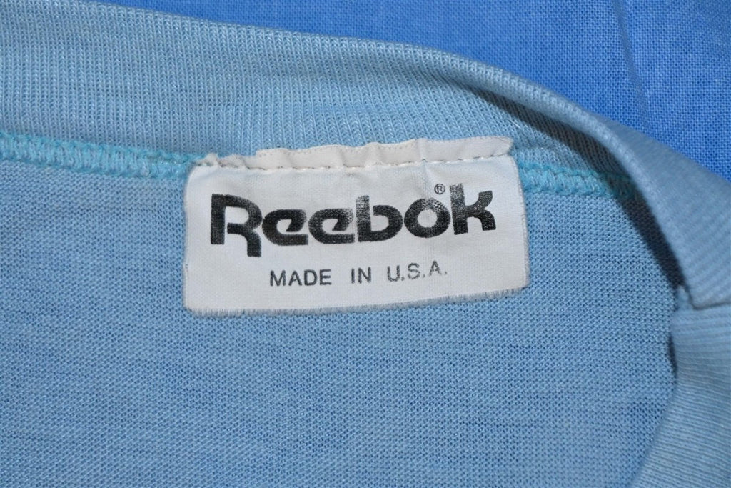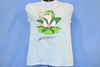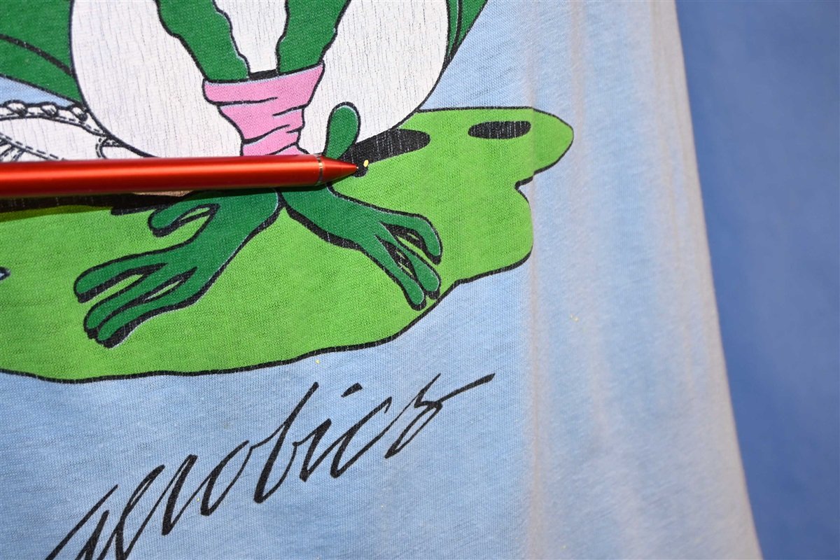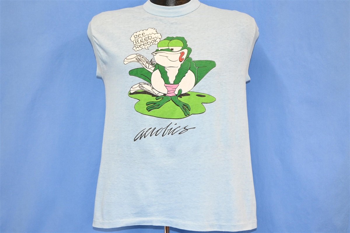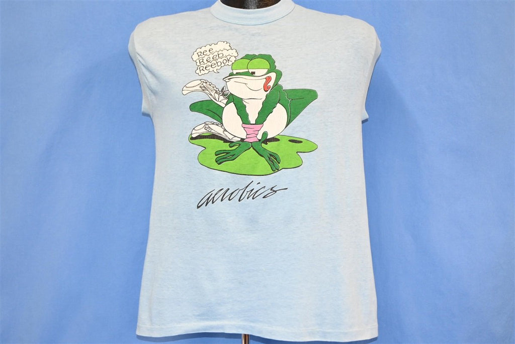 This awesome 80s muscle tank is made to promote Reebok. The graphic on this tee features a cartoon frog with a speech bubble reading "Ree...Reeb...Reebok", as opposed to a typical ribbit. The shirt also mentions aerobics, which were an incredibly popular form of exercise in the 80s. The Reebok Freestyle shoes, that are pictured on the frog, were an unofficial staple of the aerobics uniform.