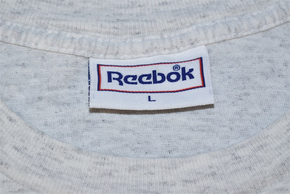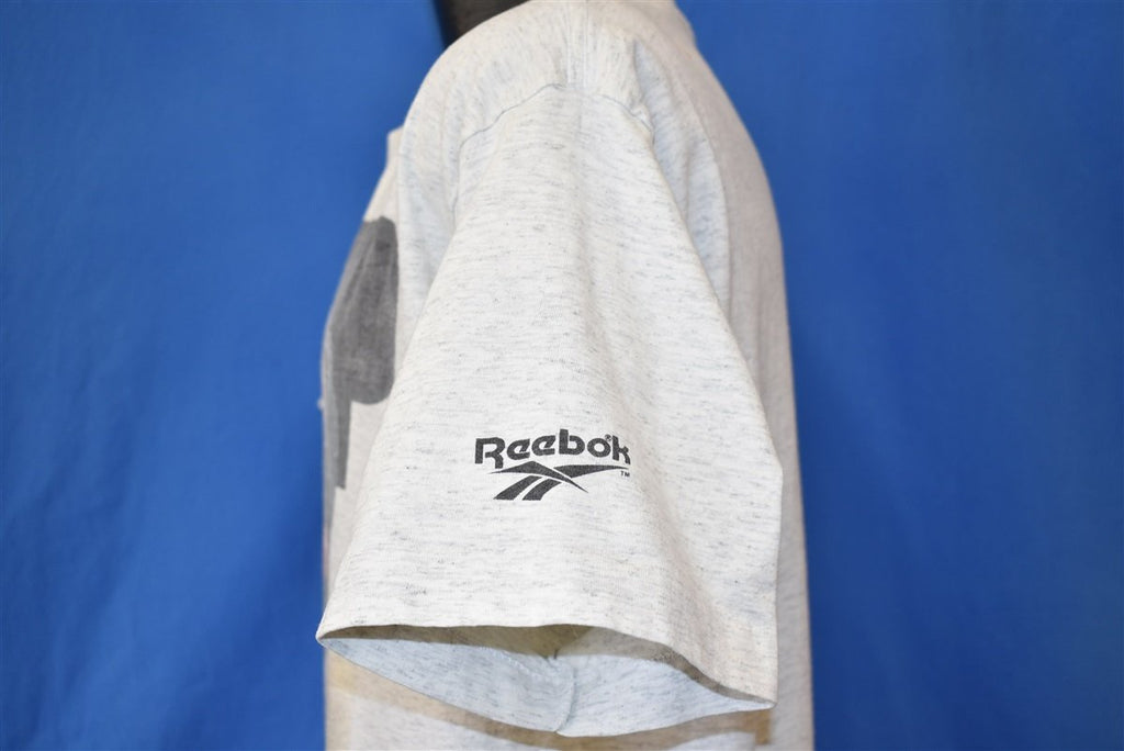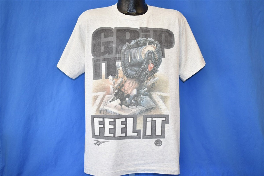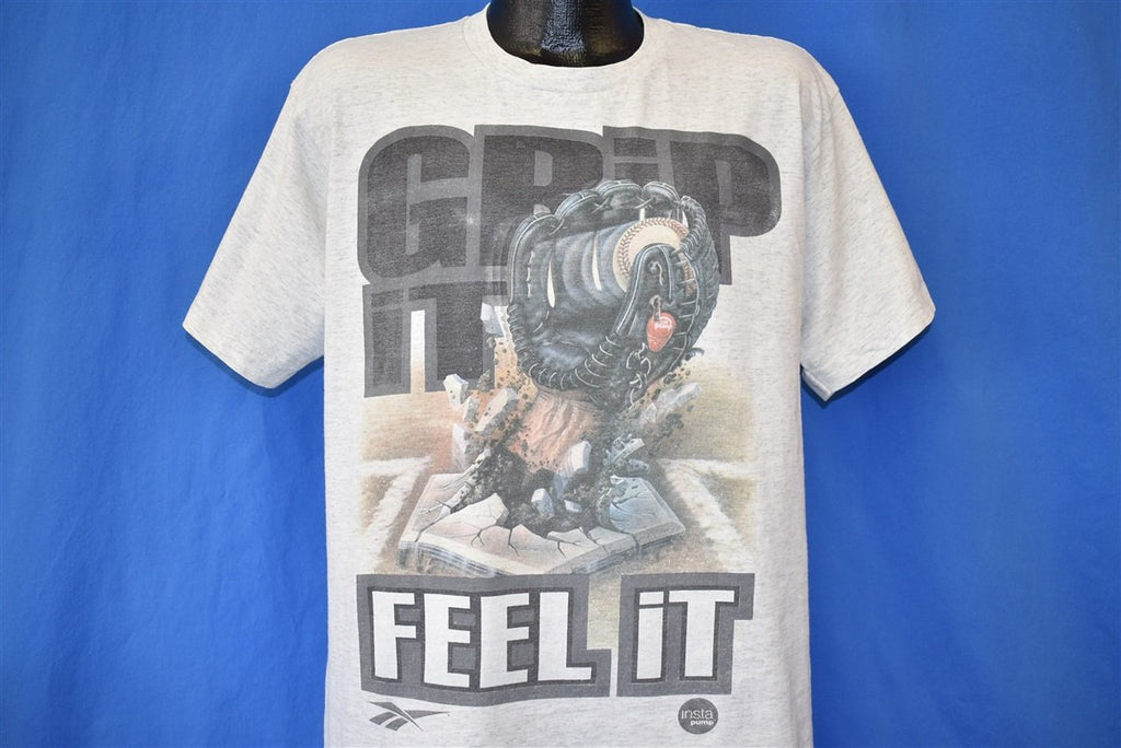 This vintage tee comes from Reebok and features the phrase, "Grip it feel it," along with an image of a baseball player's hand busting up from the ground through home plate to catch the ball.
