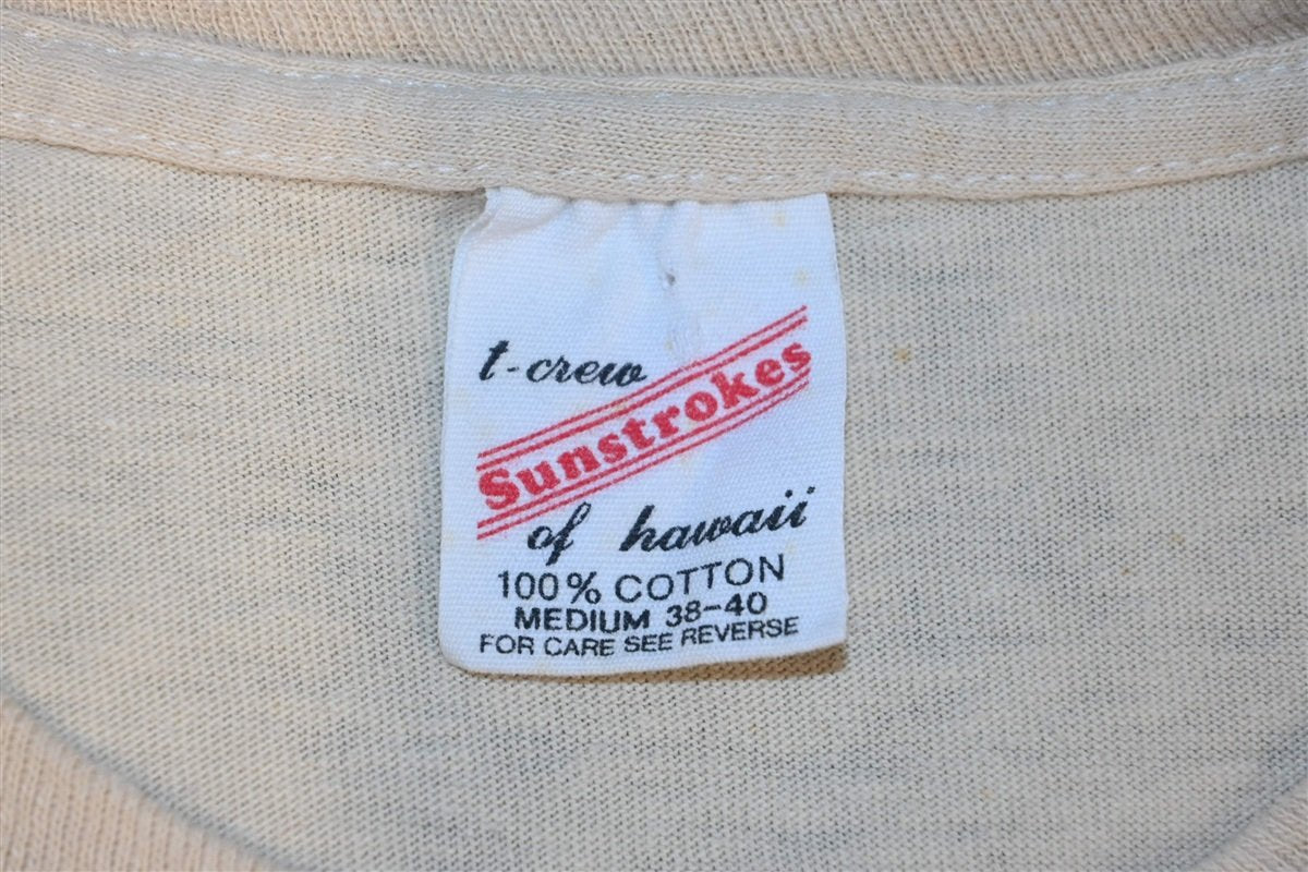 This awesome tee is a classic Sunstrokes shirt from the 70s, and it features a vibrant beach-themed graphic from Poly Tees. The shirt features a cartoon illustration from the artist Jack Feagan, that encourages you to "Dive Guam" and "Go for the big one!" Guam is a US territory found in Micronesia, and the island is known for its beautiful Pacific beaches.