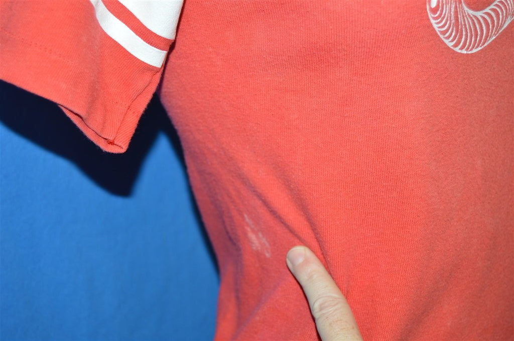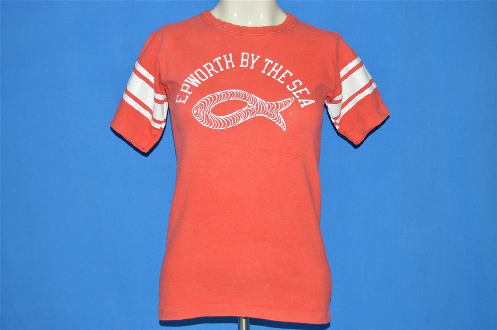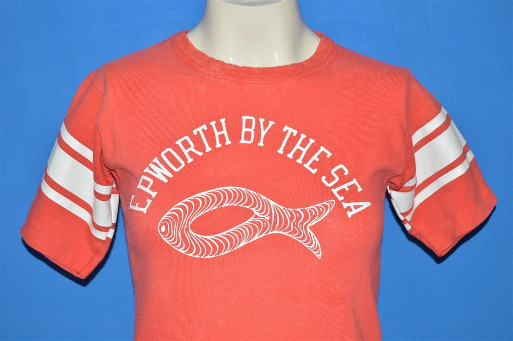 This jersey-style t-shirt is from Epworth by the Sea, a Christian conference and retreat center in Simons Island, Georgia. The shirt features stripes on the sleeves and a graphic of a fish called an Ichthys, that is used as a symbol for Christianity.