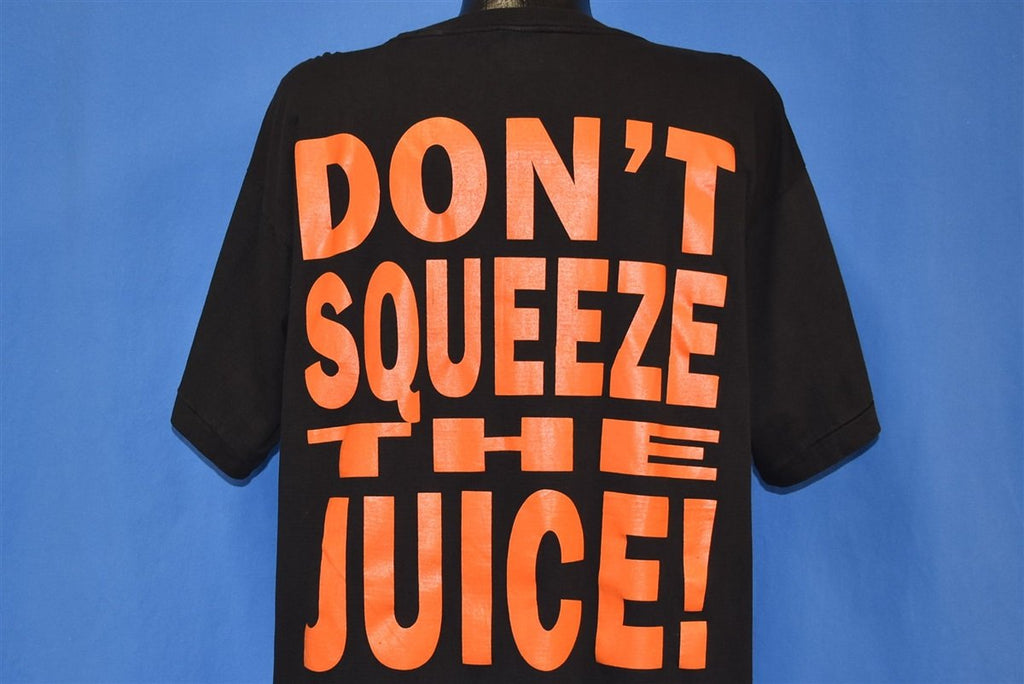This 90s vintage tee features the many rallying cries of those rooting for OJ Simpson during his notorious 1994 trial involving the murders of his ex-wife Nicole Simpson and her friend Ronald Goldman. Popular phrases by supporters included "Who Framed OJ Simpson?", "Not Guilty", "Don't squeeze the juice", and "100% Innocent". The shirt appears to be a fan made, featuring double sided print, big bold grpahics, and one hundred percent cotton.