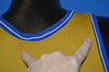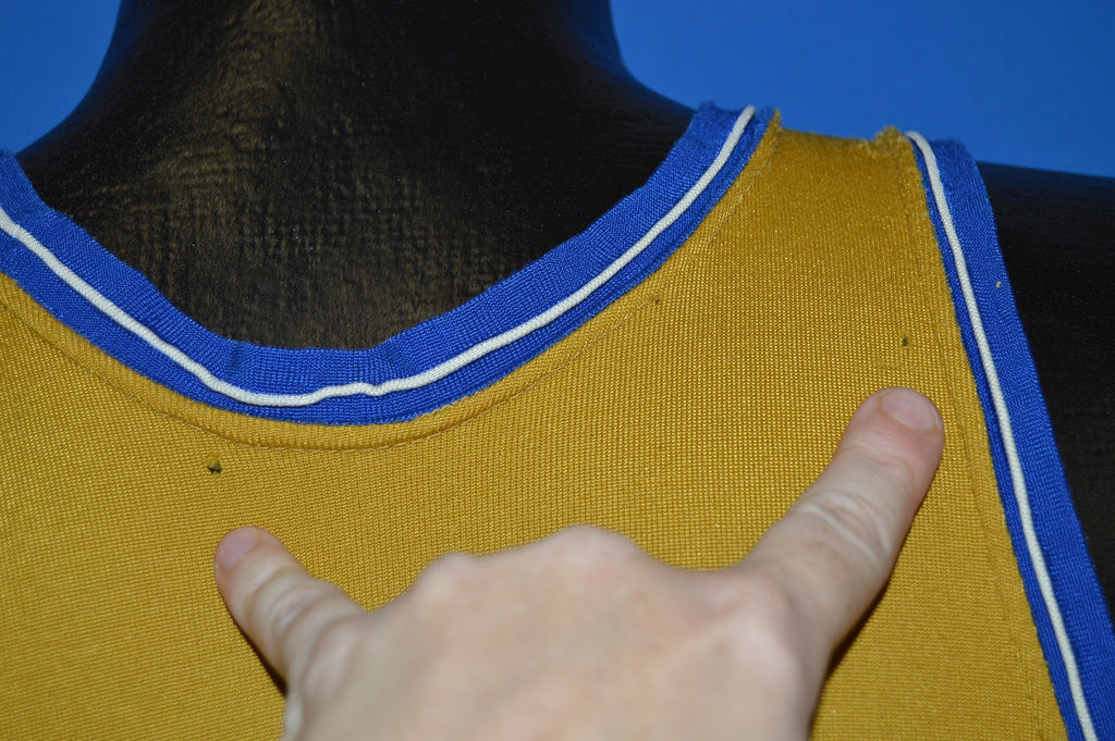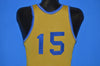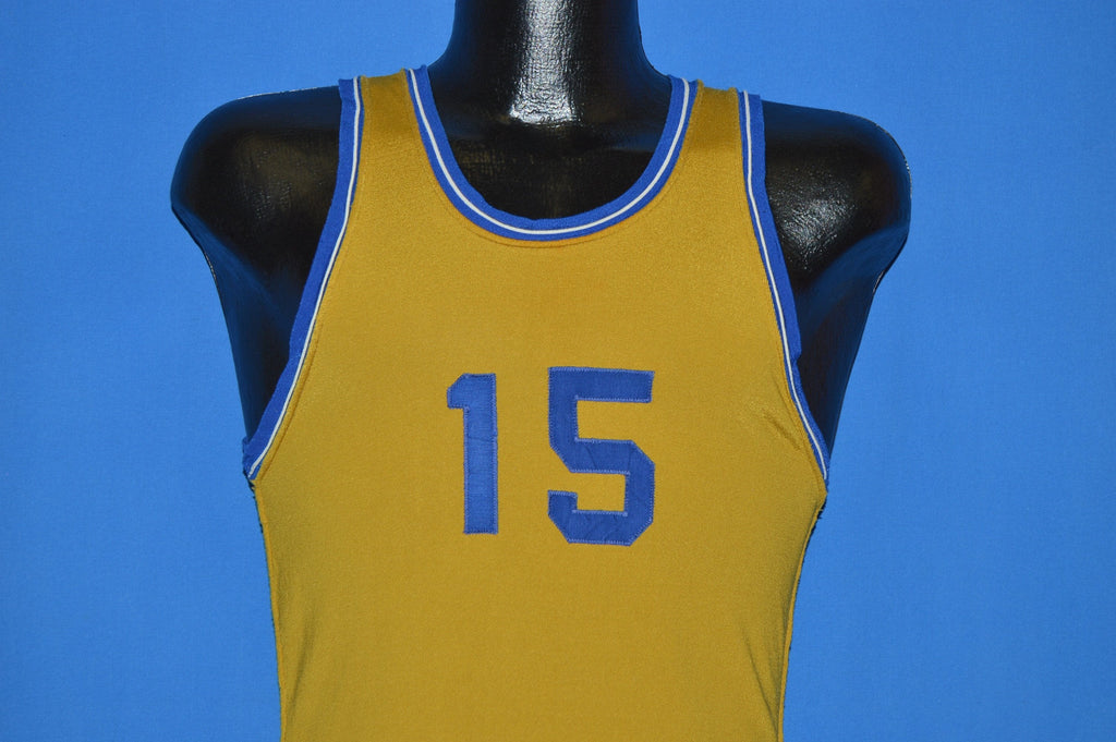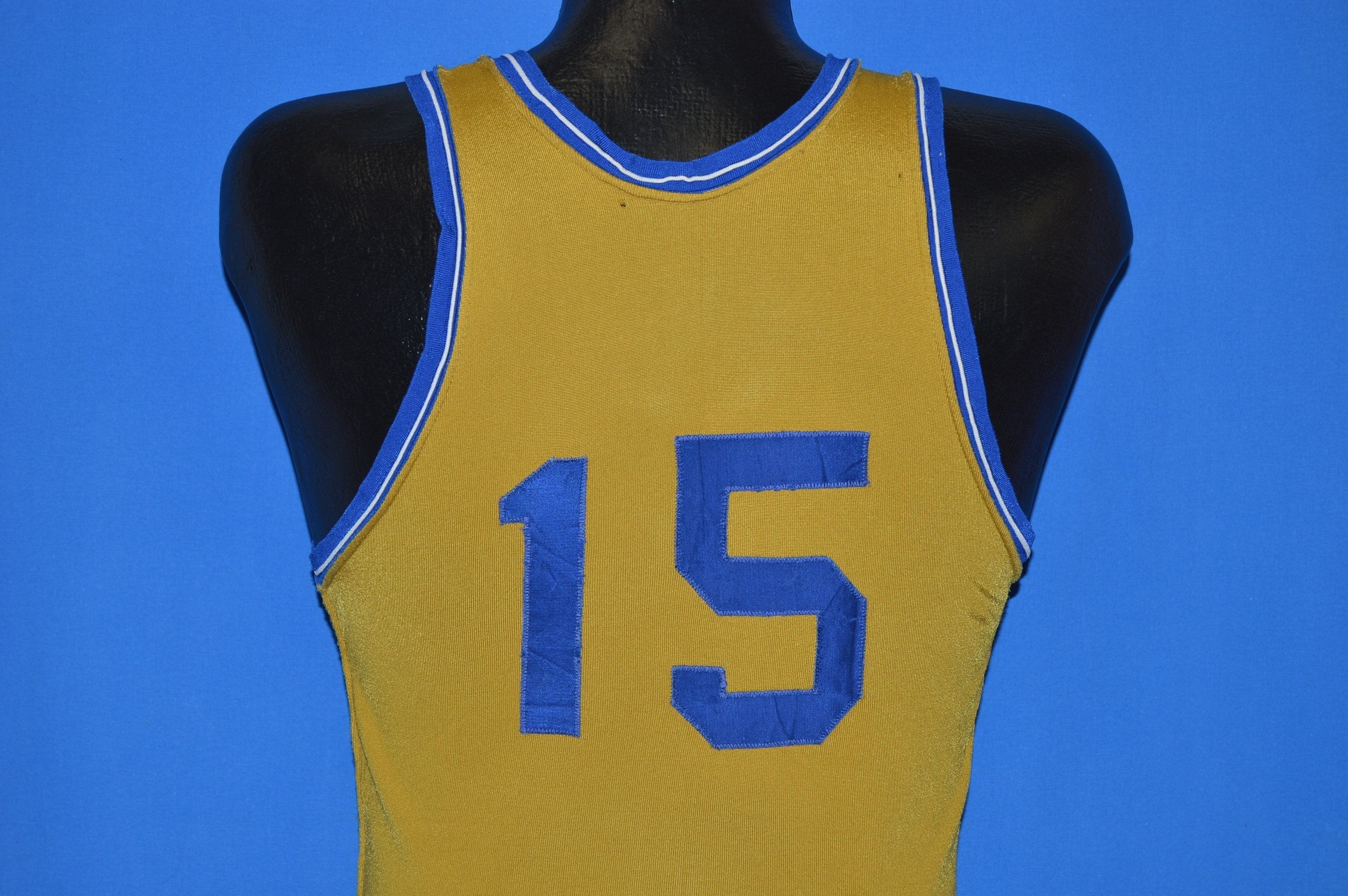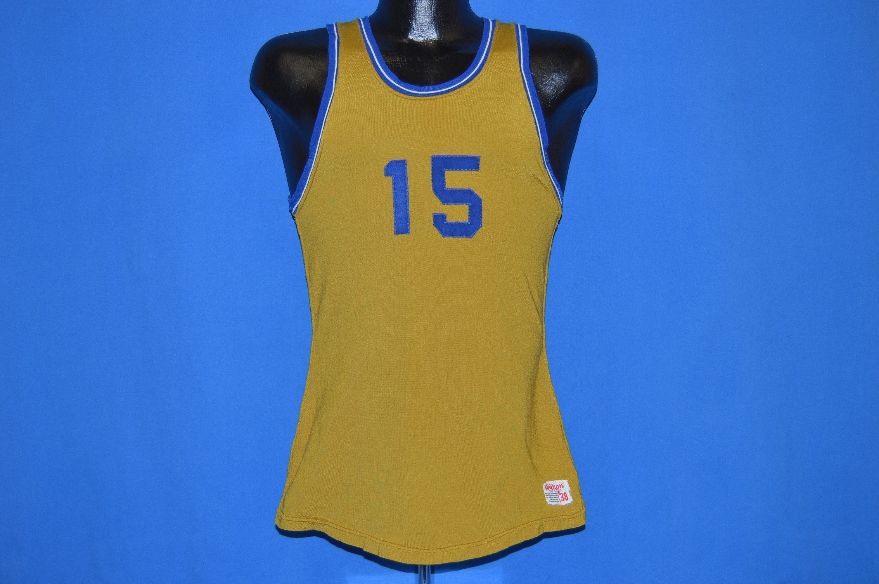 This gold colored Wilson basketball jersey has blue rings around the sleeves and collar and was made in the 60s. It has the number 15 sewn on to the back of the jersey.