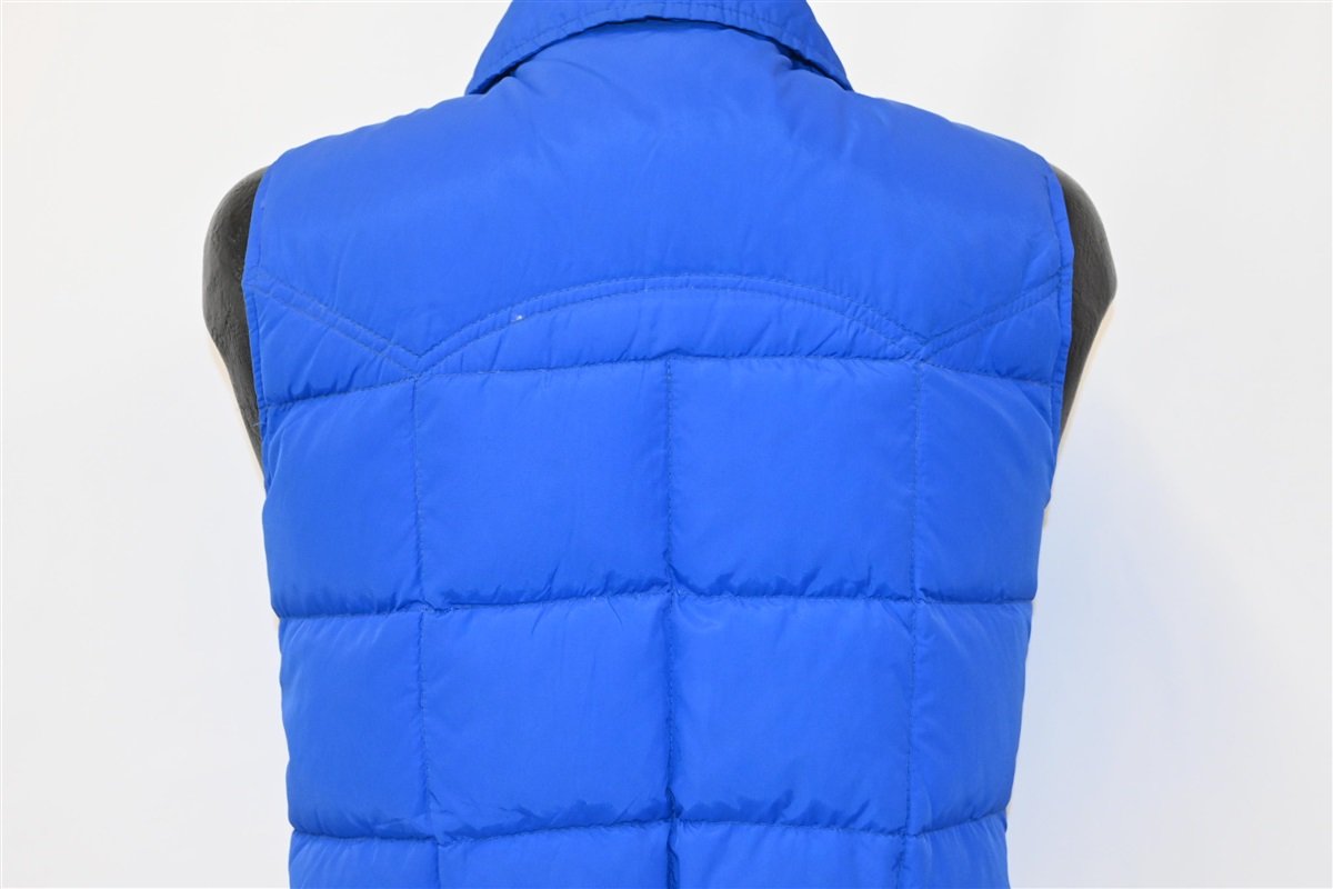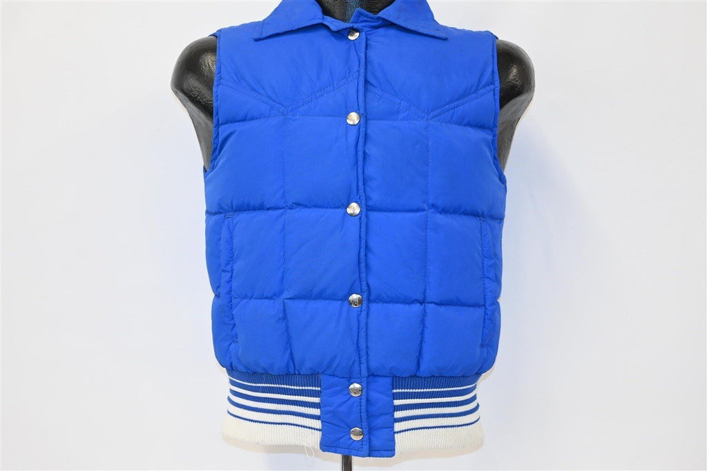 This classic winter puffer vest was made by the brand White Mountain. This vest comes in a gorgeous shade of royal blue, and features a knit waistband with white stripes. This vest is quilted with down filling to keep you insulated from the cold, and it also features snap up closures, and two hand pockets that can be zippered shut.