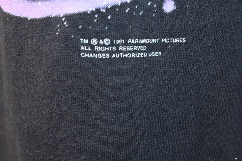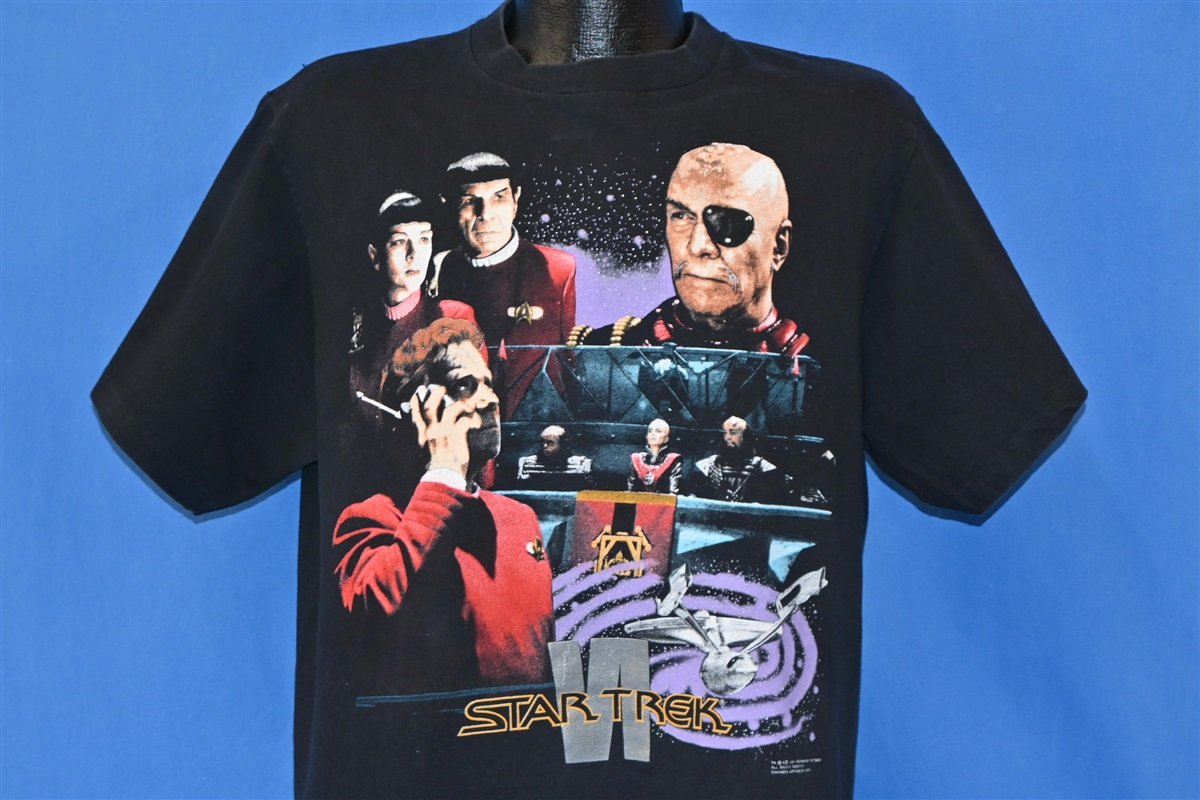 This cool vintage shirt is for the sixth feature film in the Star Trek universe, titled Star Trek VI: The Undiscovered Country. This 1991 release, was directed by Nicholas Meyer, the same creative mind behind one of the franchise's most popular films, The Wrath of Khan. The initial idea for this sixth installment was a prequel featuring younger actors playing the future crew of the USS Enterprise, but the premise was changed after a negative reaction by fans. Leonard Nimoy helped writers Lawrence Konner and Mark Rosenthal to come up with a new story starring the cast of Star Trek: The Original Series, including William Shatner, DeForest Kelley, Walter Koenig, Nichelle Nichols, James Doohan, George Takei, and Nimoy himself.