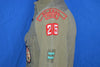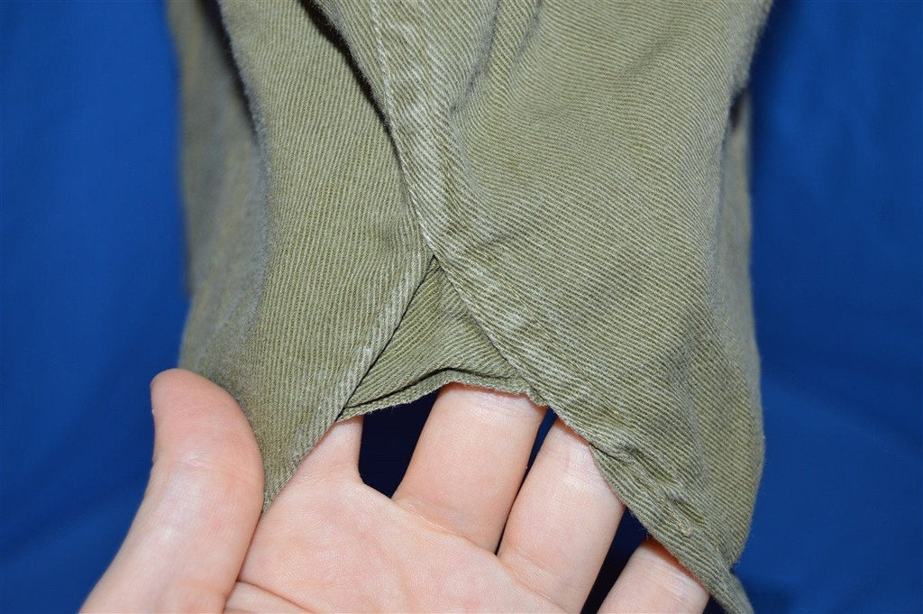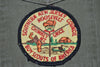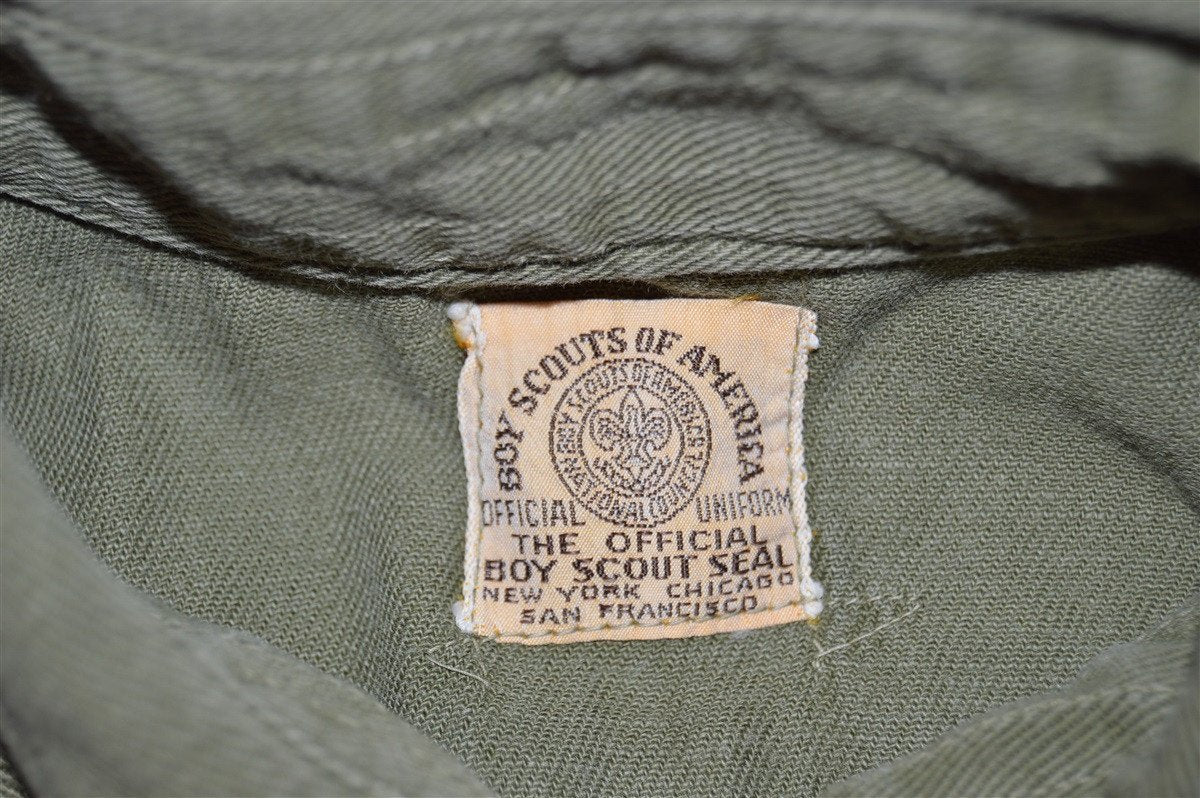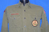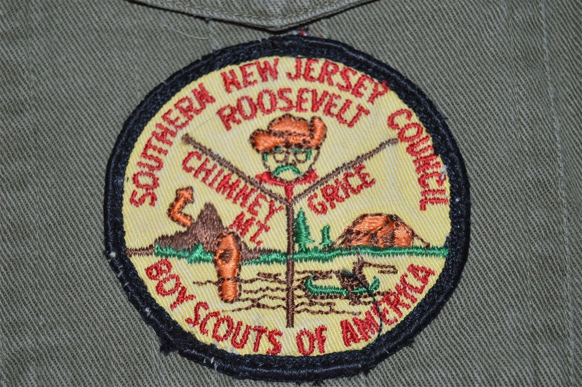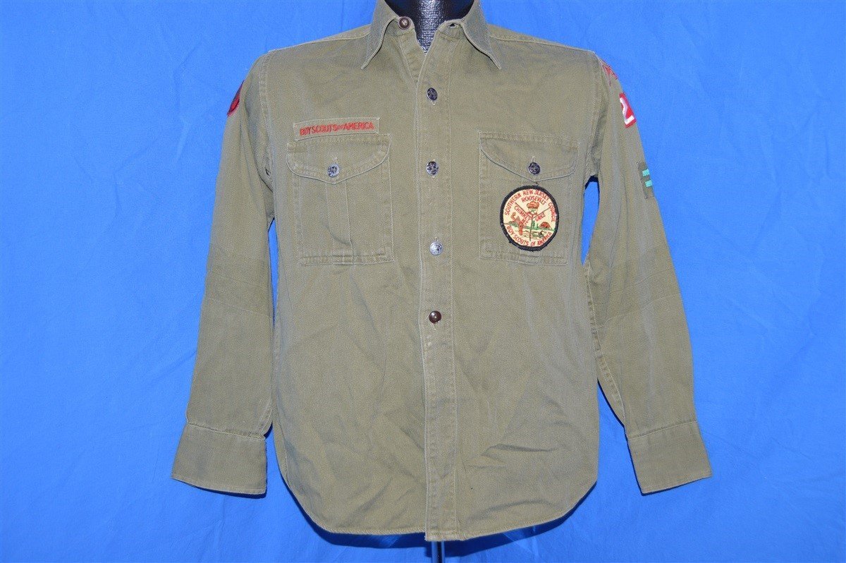 This green button down shirt is a vintage boy scouts uniform. The shirt still has patches from Troop 25 in St. Paul, Minnesota. The left chest pocket has a patch from the Southern New Jersey Council. The patch has an image of Roosevelt, Chimney Mt., and Grice. The buttons on the front are change buttons.