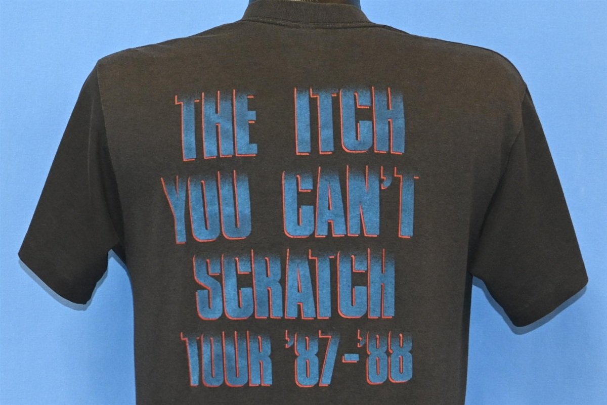 This awesome tee is for the Los Angeles based band Faster Pussycat, and it commemorates their Itch You Can't Scratch Tour from 1987. The group emerged out of California's thriving glam metal scene in the 80s, and they took inspiration for their name from the cult film Faster, Pussycat! Kill! Kill! Amidst the rise of the heavy metal trend, the band was signed to Elektra Records, and they released their self-titled debut album in 1987. The album managed to reach No. 97 on the Billboard chart, and the group gained reasonable attention thanks to the music videos for the songs "Bathroom Wall" and "Don't Change That Song".