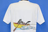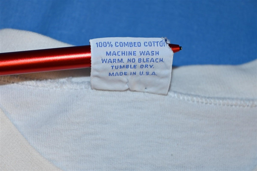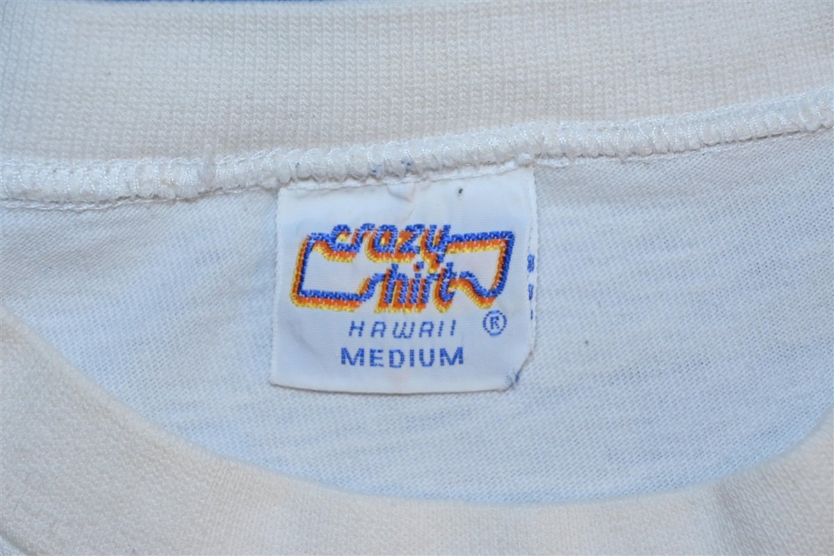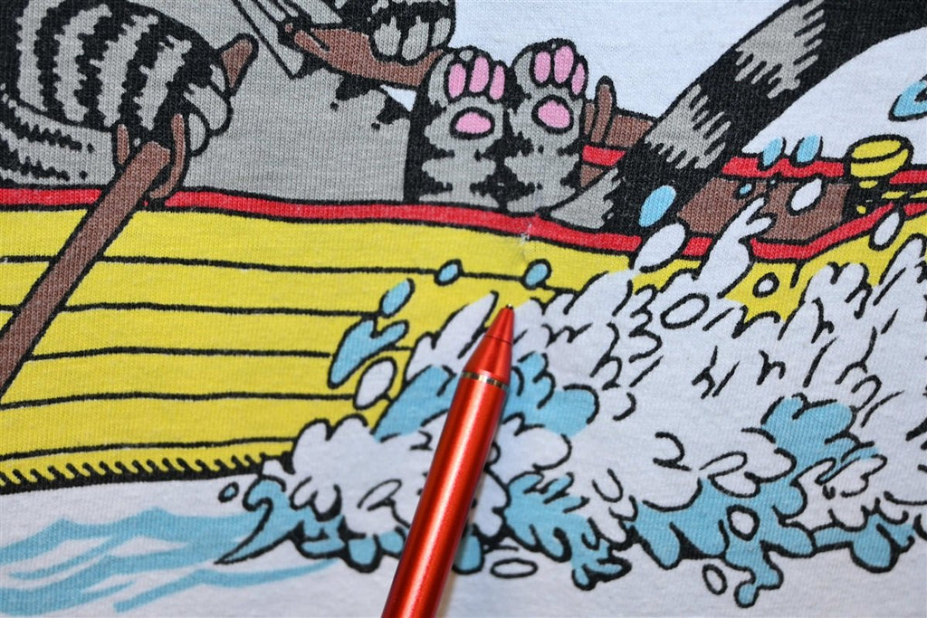 This awesome tee was made by Crazy Shirts Hawaii sometime in the 80s. It features double sided graphics of B. Kliban's iconic cartoon, Fat Cat. He's shown waterskiing with a case of Lolo beer on the front and he's rowing the boat that the ski is attached to on the back. Crazy Shirts got its start in Waikiki in the 60s selling airbrushed tees to tourists. Since then, the company has expanded to selling printed tees online and all over the world. Crazy Shirts still regularly has a B. Kliban's Fat Cat collection for sale on their website.