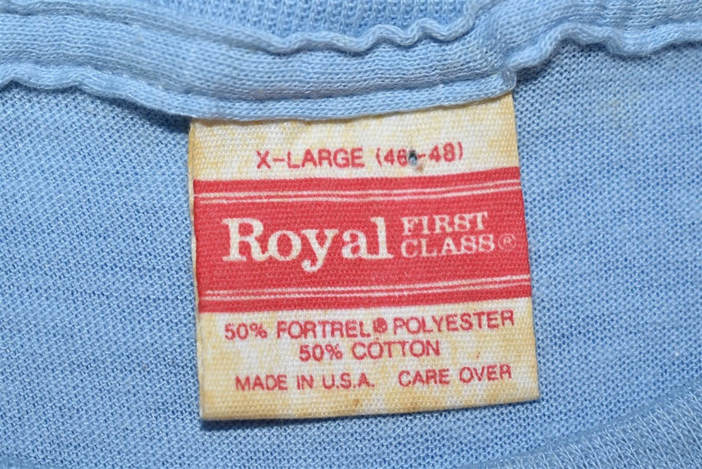 This vintage tee has held up beautifully since the 1980s, capturing that old school magic for years to come. Features awesome cartoon graphics, soft poly cotton, and a classic Royal First Class tag. Very comfy and fun to look at. The motto is a humorous play on the old saying "An apple a day keeps the doctor away". This version goes, "A beer a day keeps the bod this way".