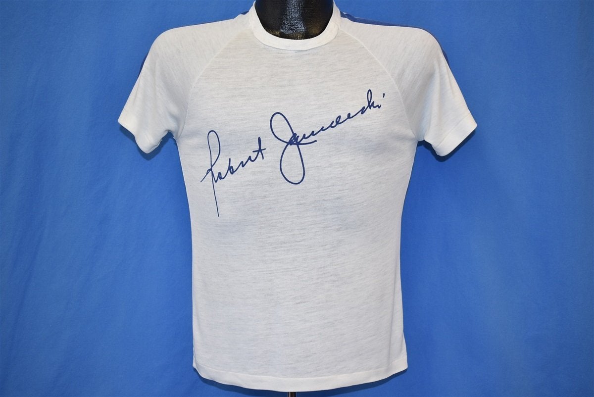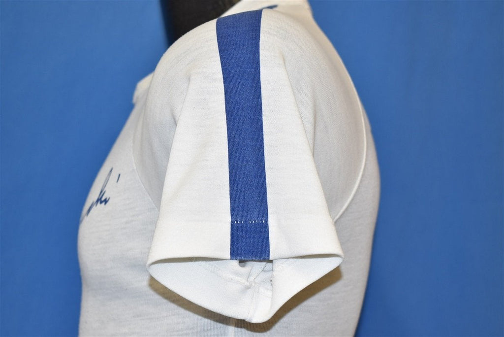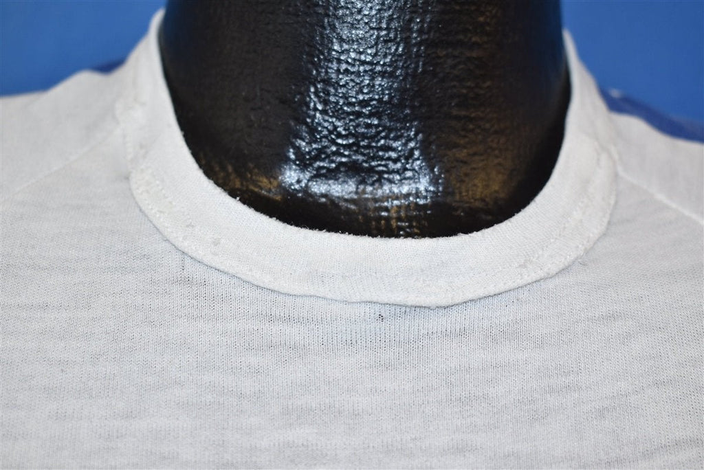 Fits like a modern unisex adult small. Wear around the collar, soft and thin. Double sided print.